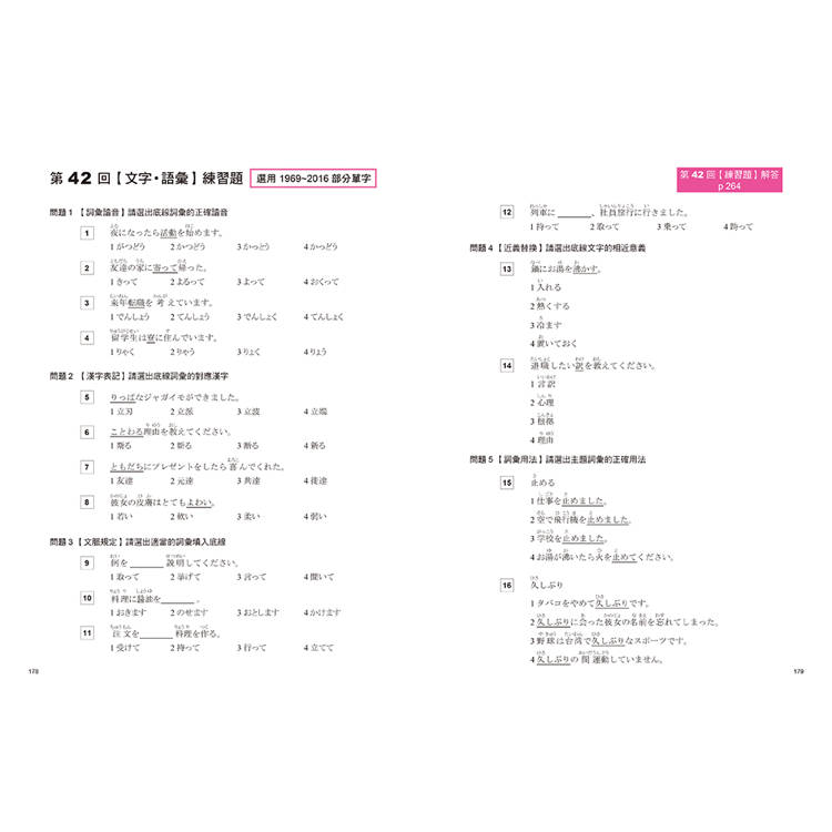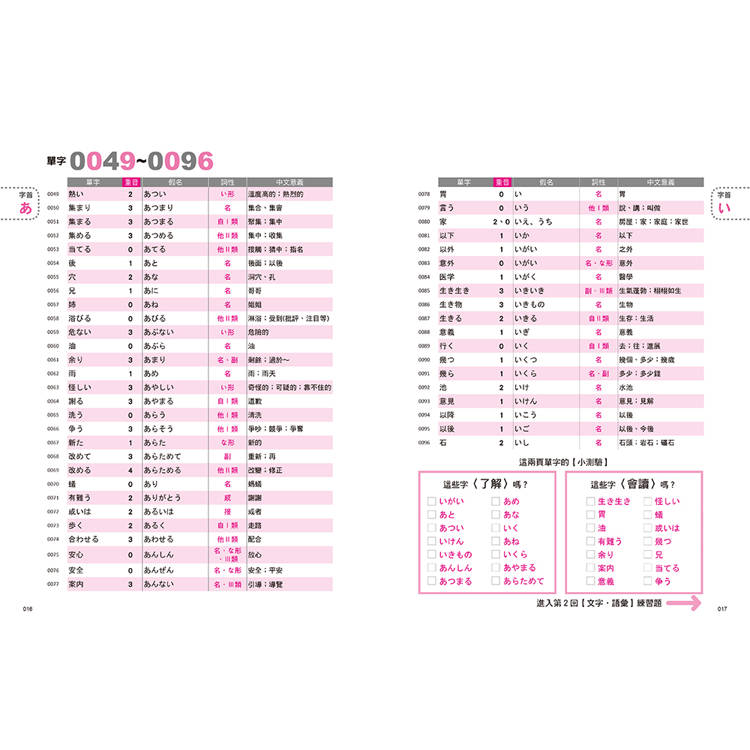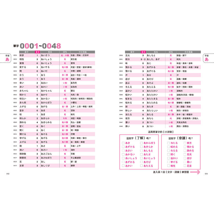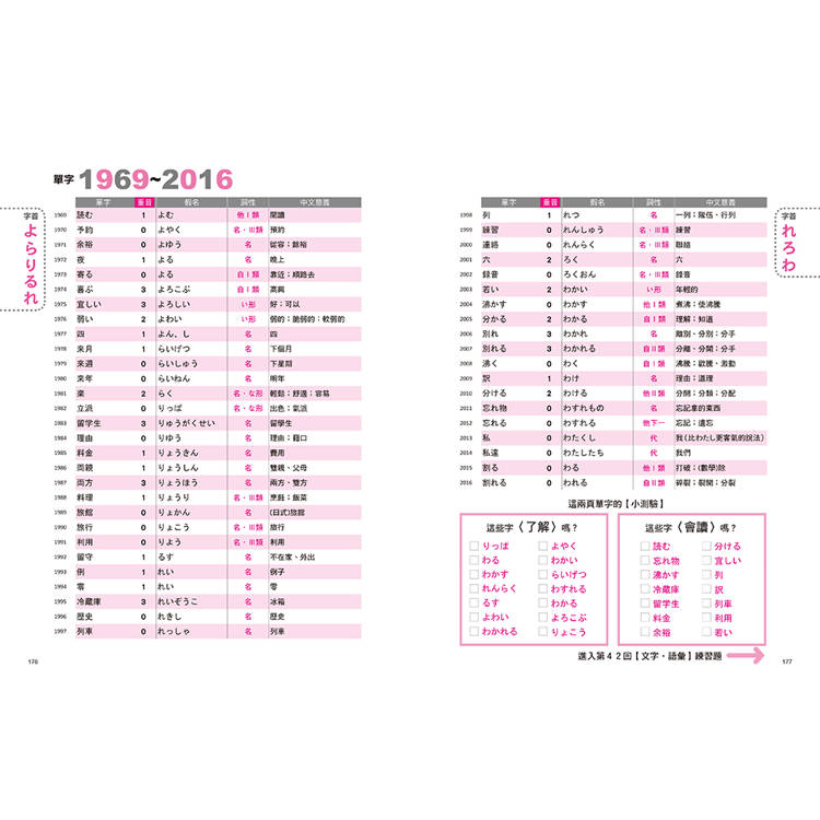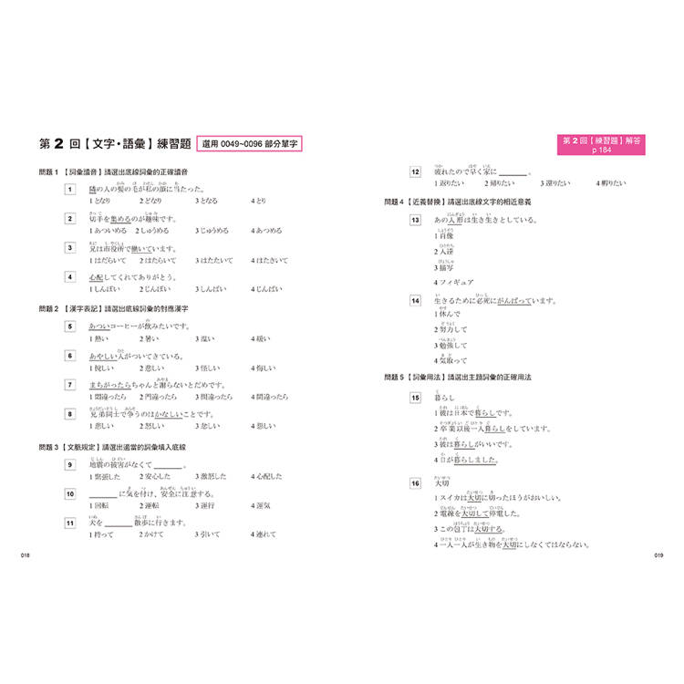 學完每兩頁 48 個單字,可透過「這些字〈了解〉嗎?」「這些字〈會讀〉嗎?」兩個小測驗,檢測剛背過的單字 ──「看到假名,是否知道字義?」「看到漢字表記,是否知道讀音?」再次強化單字印象,然後進入模擬正式考題的【文字‧語彙】練習題。