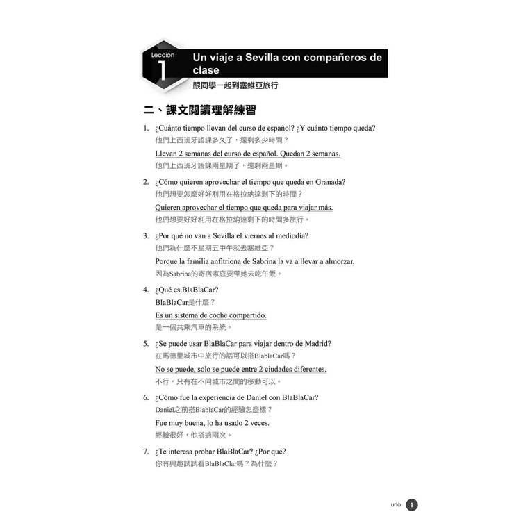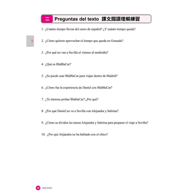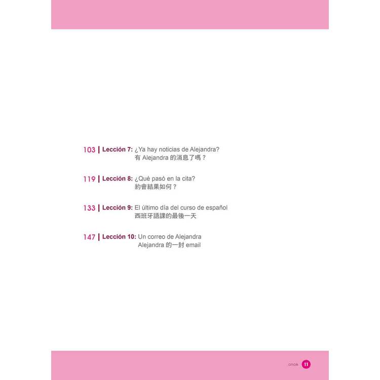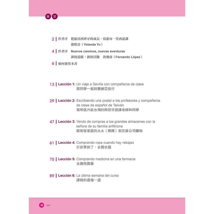 本書共10課,每課除了有引人入勝的故事情節,皆依照以下4個步驟,透過課文閱讀理解練習、生詞、語法與句型等活潑又扎實的內容,帶你用西語暢談文化!