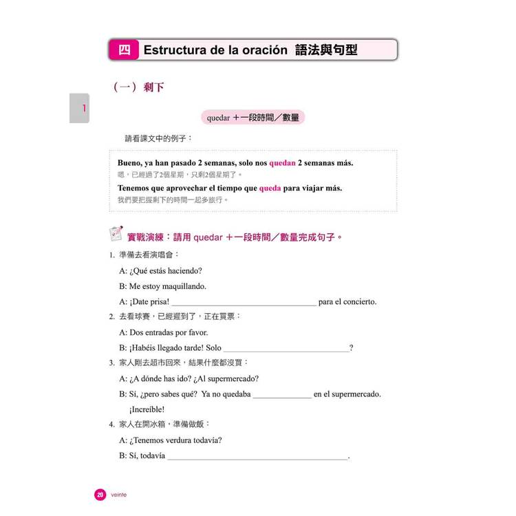 ‧實戰演練:請用quedar+一段時間╱數量來完成句子。