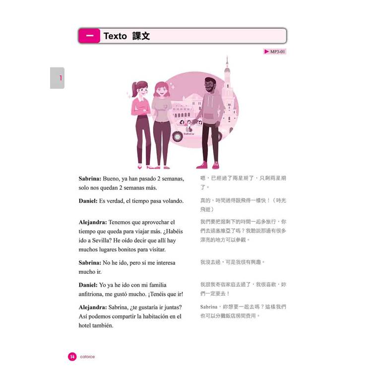 如連載小說般的故事情節,讓你等不及翻到下一課!課文依情境不同,有短文、有對話,皆採兩欄式西語、中文對譯,可以先遮住中文部分挑戰自己的理解力,再掀開確認不懂的地方。還有為故事情節量身打造的精美插圖,場景、人物躍然紙上!