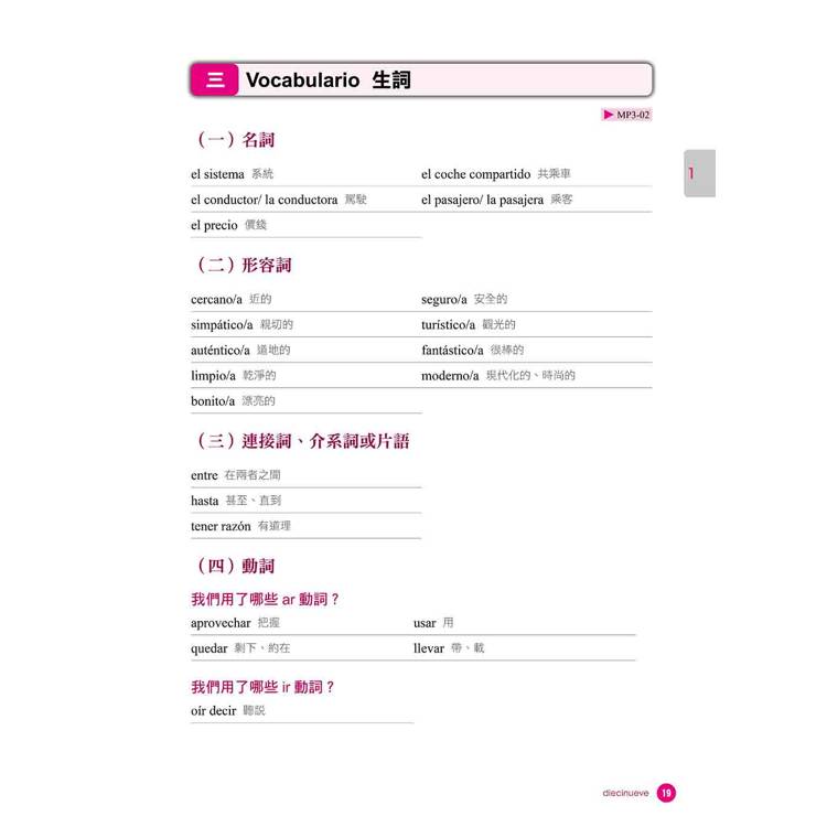 挑出課文中出現的重點生詞,並依名詞、動詞、形容詞等詞性分類,方便查找。最重要的動詞部分,更依照「ar動詞」、「er動詞」、「ir動詞」、「反身動詞」進一步分類,閱讀課文時,不妨先試試自己是否都找到了,並用生詞表來確認喔!