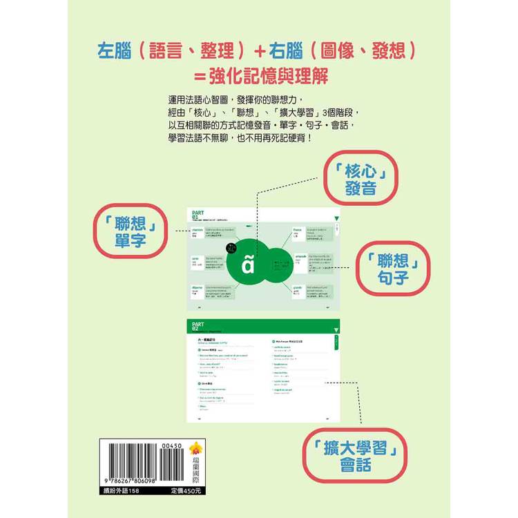 秉持這個理念,本書除了介紹34個法語的音標之外,同時也利用心智圖的學習模式:從音標往外擴張至單詞,然後再到完整的句子,最後以情境式的對答結尾。如此語音、文字配合圖像模式把知識有架構地具體化,不僅資訊的儲存更有條理,三合一的學習法,更能讓大腦快速反應,因為一旦接受了其中一個元素的刺激,就能馬上牽動其他相關的資源。