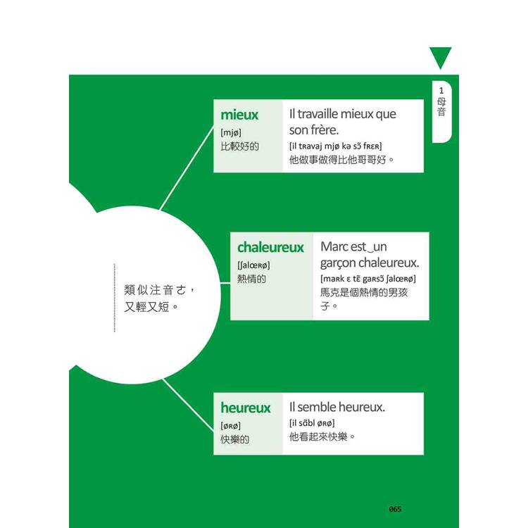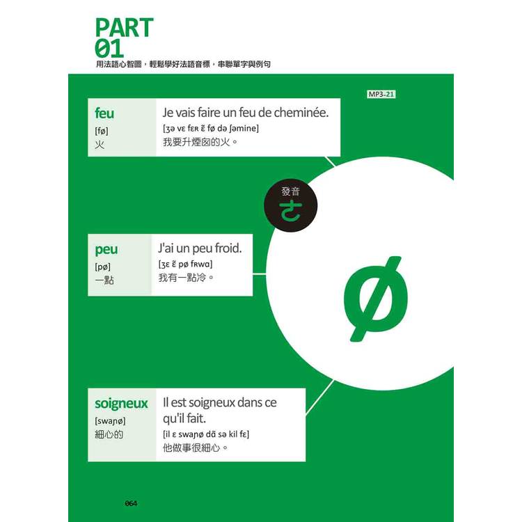 PART01將帶領你由34個音標邁向單字和例句,每個音標都輔以注音或中文發音,且有詳細發音說明,並延伸出6個陽性單字(深色頁面)、6個陰性單字(淺色頁面)、每個單字都有例句。例:從音標[ε]作為起點,接著認識關聯的單字「sel [s?l] 鹽巴」、「baguette [bag?t] 長棍」,最後延伸學習單字的例句「Ce plat manque de sel. [sə pla mɑ̃k də s?l] 這道菜少的點鹽巴。」、「Je sors acheter une baguette de pain. [ʒə s?ʀ a?te yn bag?t də pε̃] 我出門去買一條長棍麵包。」。
