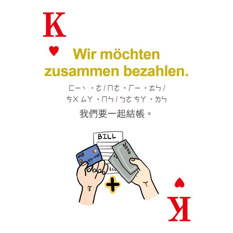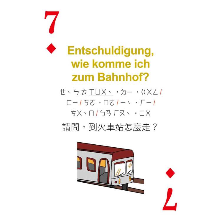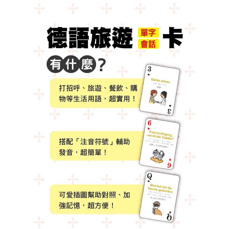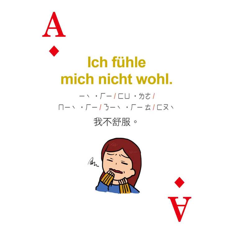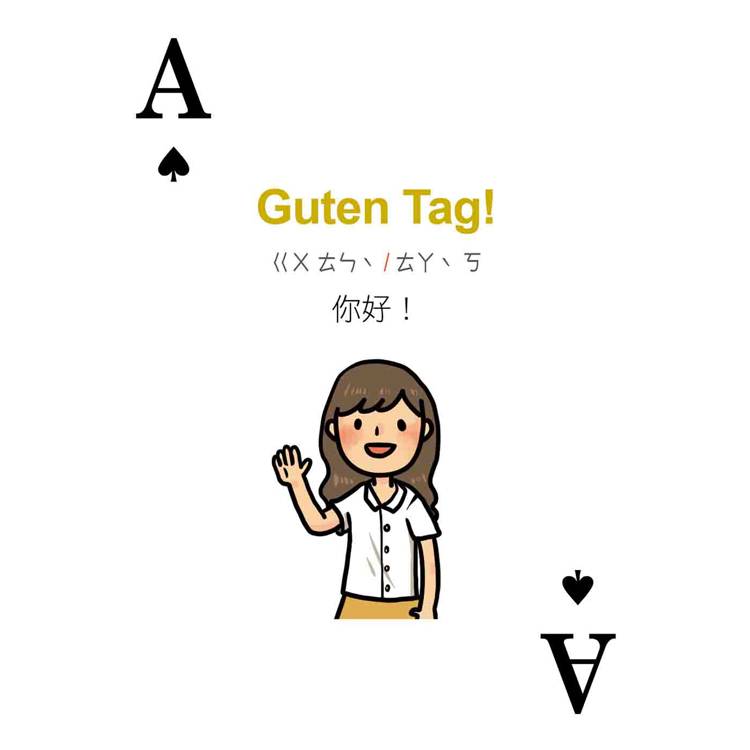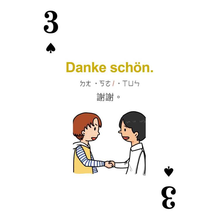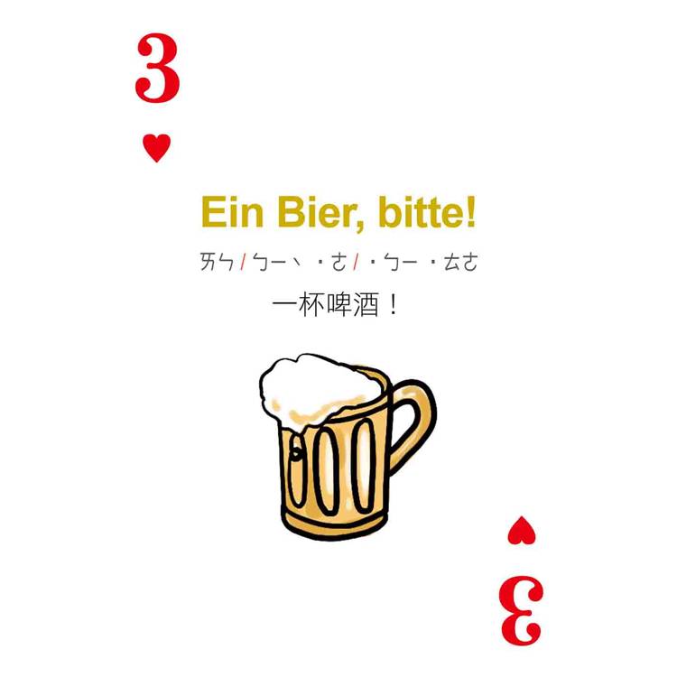 打開撲克牌玩一玩!每張撲克牌都有德語、中文解釋,加上注音符號輔助發音,只要跟著讀、照著唸,德語一點都不難!