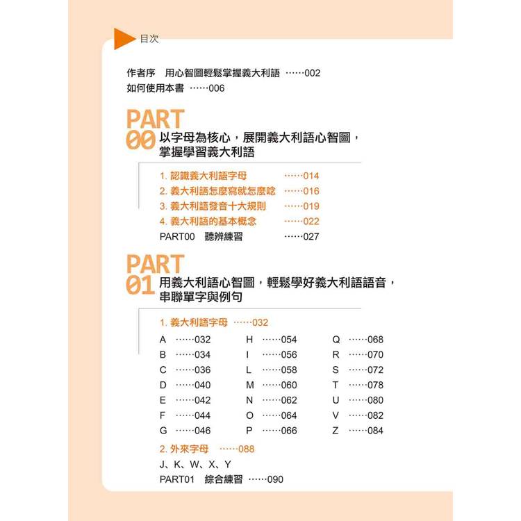 首先,在PART00這個單元裡,從認識「義大利語字母」開始,然後延展了解「義大利語發音十大規則」,再到義大利語基本概念的「名詞、形容詞、冠詞的陰陽性與單複數」、「動詞變化」,讓你在開始學習義大利語之前,掌握學習義大利語的重點!