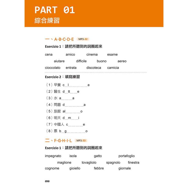 到了PART01,將帶領你進入最主要的傳統義大利語21個字母+5個外來字母學習。在這個單元中,作者除了說明字母的音標外,還標示每一個字母的隸屬音,每個字母皆提供6個單字、6個例句。