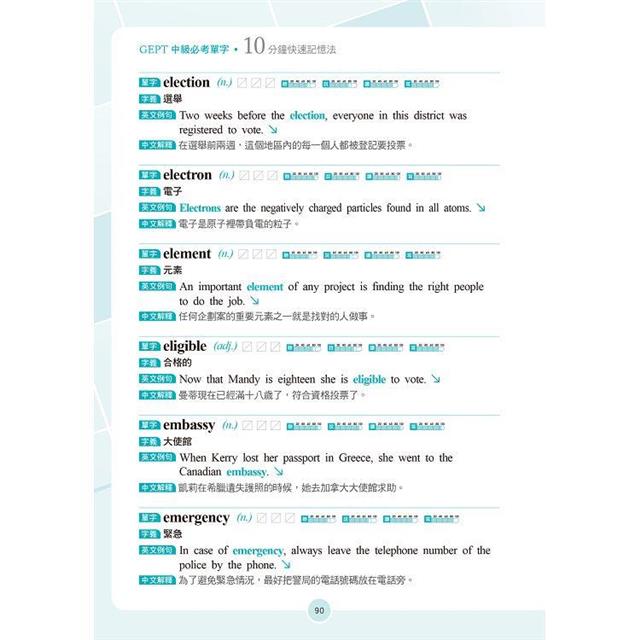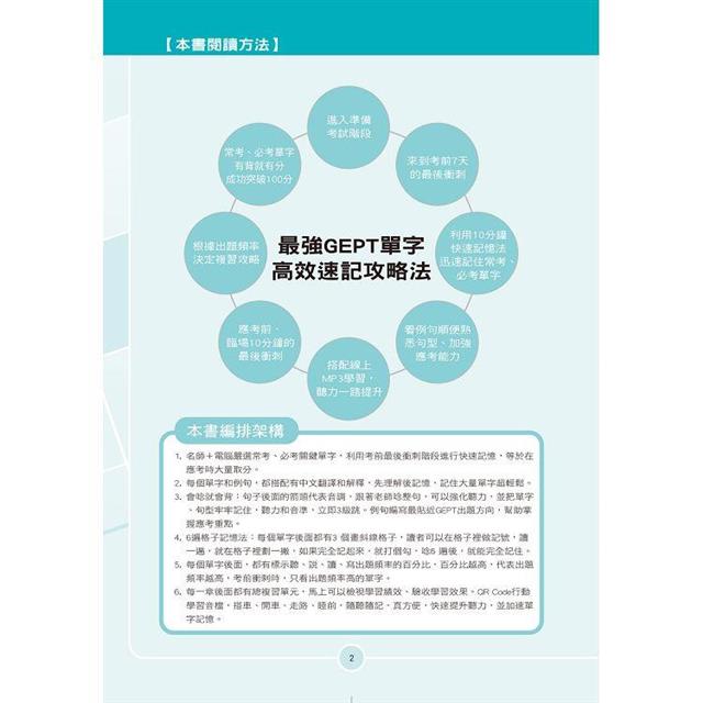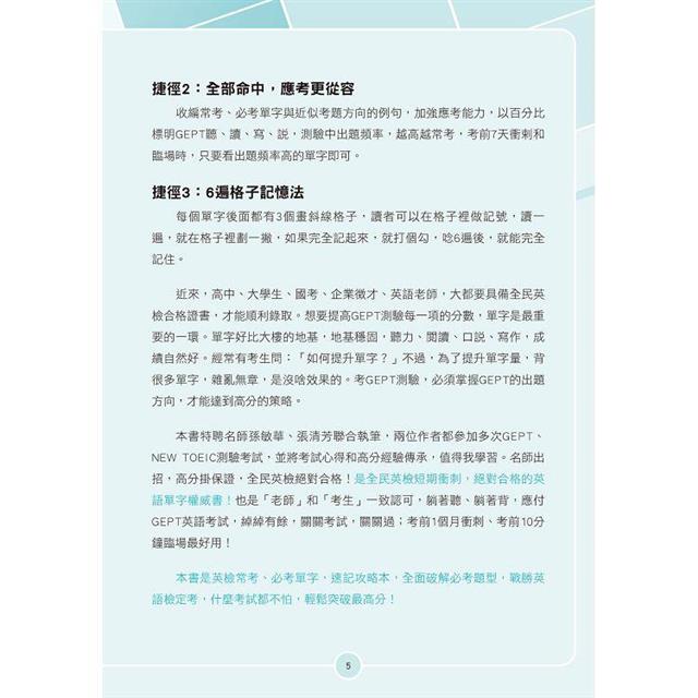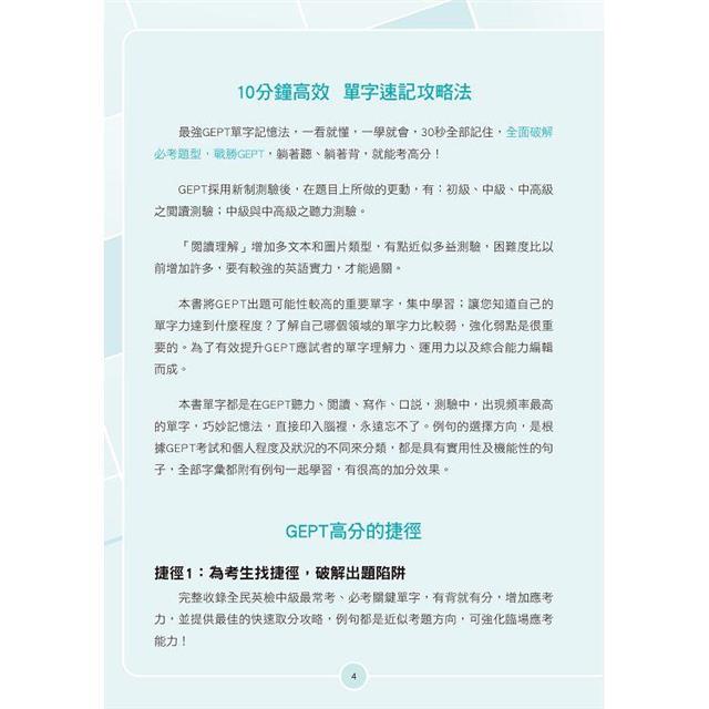 本書單字都是在GEPT聽力、閱讀、寫作、口說,測驗中,出現頻率最高的單字,巧妙記憶法,直接印入腦裡,永遠忘不了。例句的選擇方向,是根據GEPT考試和個人程度及狀況的不同來分類,都是具有實用性及機能性的句子,全部單字彙都附有例句一起學習,有很高的加分效果。
