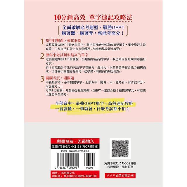 完整收錄GEPT中級必考單字,將出題可能性較高的重要單字,集中學習才是良策;了解自己的單字實力到哪裡?強化弱點是很重要的。