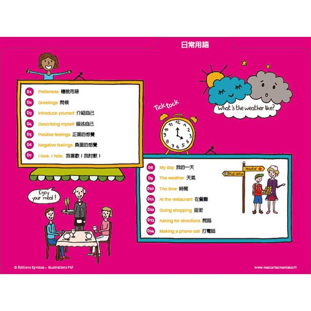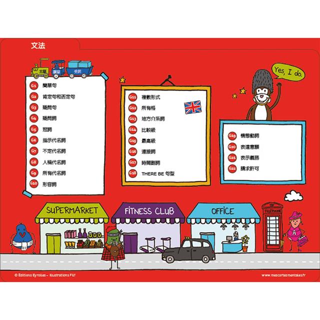 數學心智圖寶盒的成功讓我毫不猶豫地再次與法爾芙合作,腦力激盪,創作出80張色彩豐富、好玩的心智圖。從字彙到文法,你可以在日常生活中,和孩子們一起輕鬆地學英語。