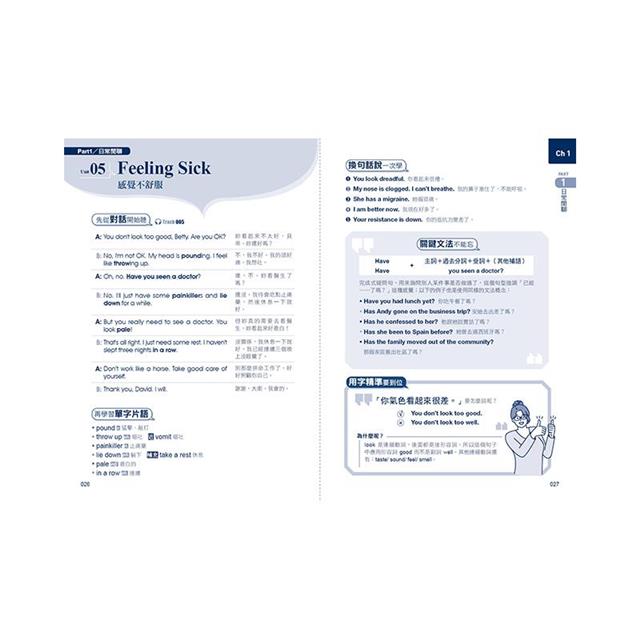 每個單元附有「用字精準要到位」環節,羅列用語細節中的常見錯誤,仔細解析各個文法、片語及固定用法的正確形式,深入了解英文用法的眉眉角角,準確避開中文思路的語言盲點,對話越說越道地!