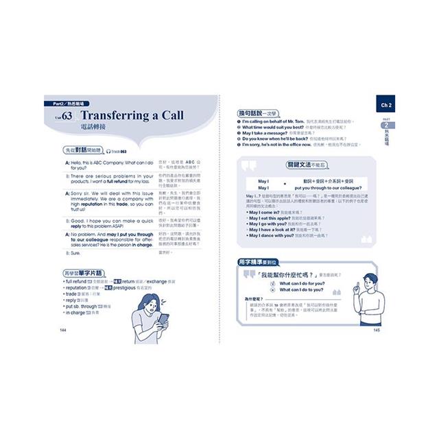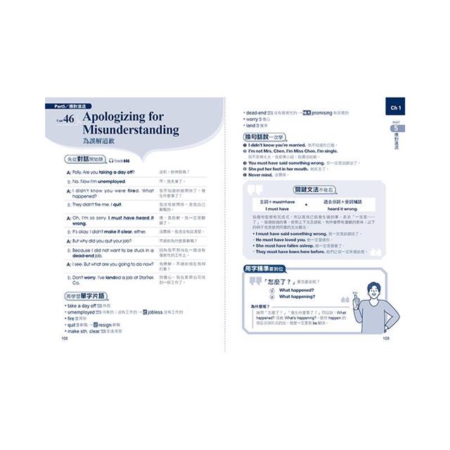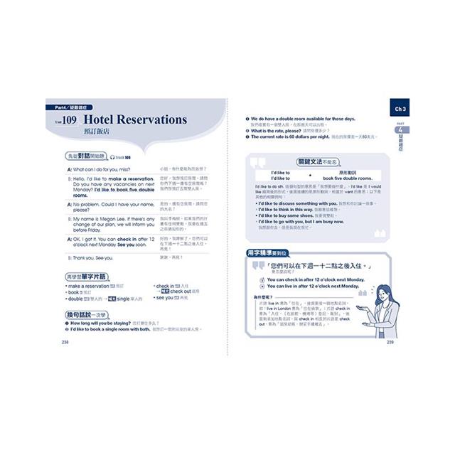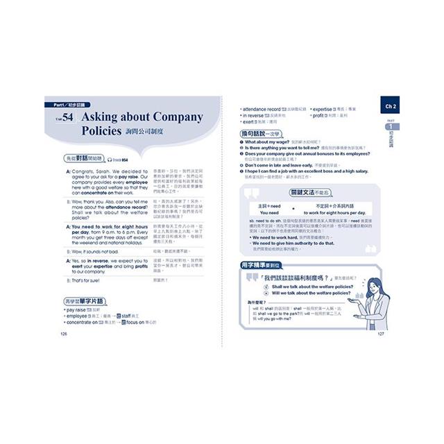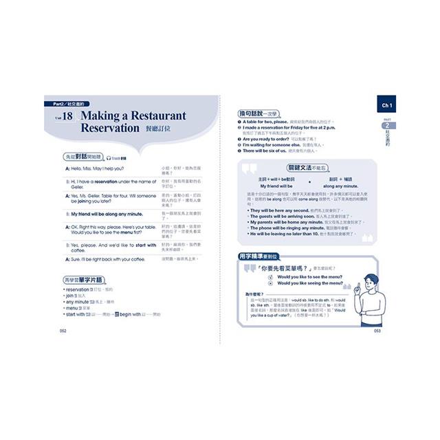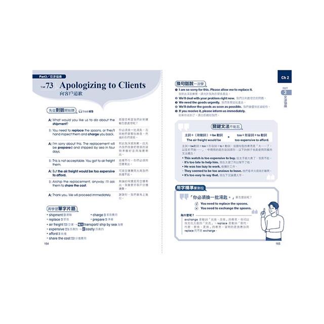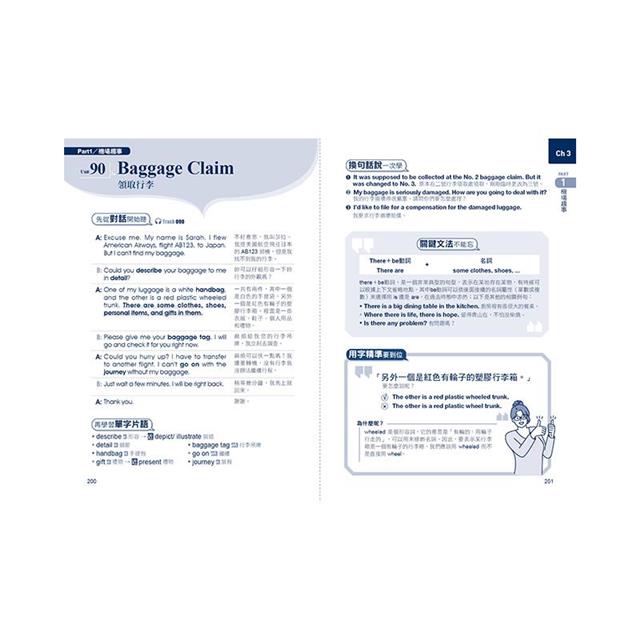 全書分為「生活大小事、職場萬事通、外出旅遊趣」三大面向,包含日常閒聊、人際應對、職場協商與旅遊交通等主題,針對不同情境中可能面對的狀況設計對白,共有115篇豐富會話,讓你面對各種情境都能應答如流。