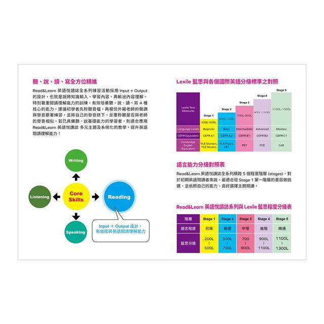 Read&Learn 英語悅讀誌是一系列以主題導向及知識型內容與練習活動為特色的分級悅讀誌,期望引導讀者建立良好的閱讀理解能力。悅讀誌系列涵蓋了各式各樣的主題:從個人、家庭、周遭環境出發,未來將會延伸到社會、文化、歷史、科學及其他應用面的學科,皆與孩子的學習發展歷程環環相扣。