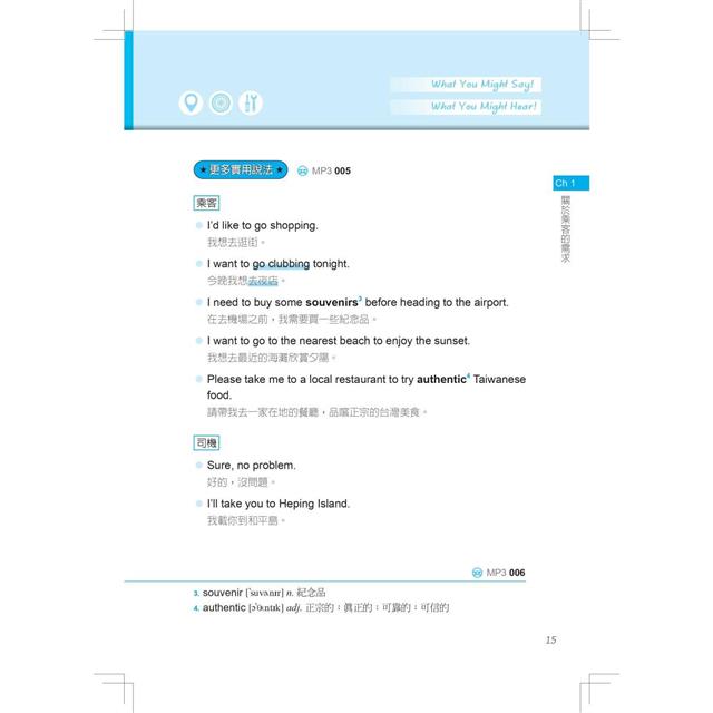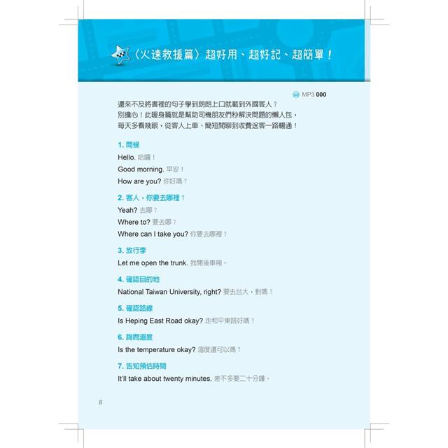 最重要的是,本書特別規劃「火速救援篇」,除了作為暖身之外,主要的用意是提供讀者「現學現賣」的基礎短句,全都是從書中挑選出的精華中之精華,萬一才剛購買本書就馬上載到外國乘客,本篇內容必可協助解決燃眉之急!