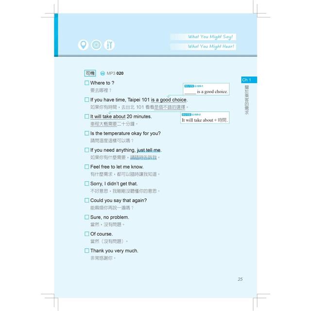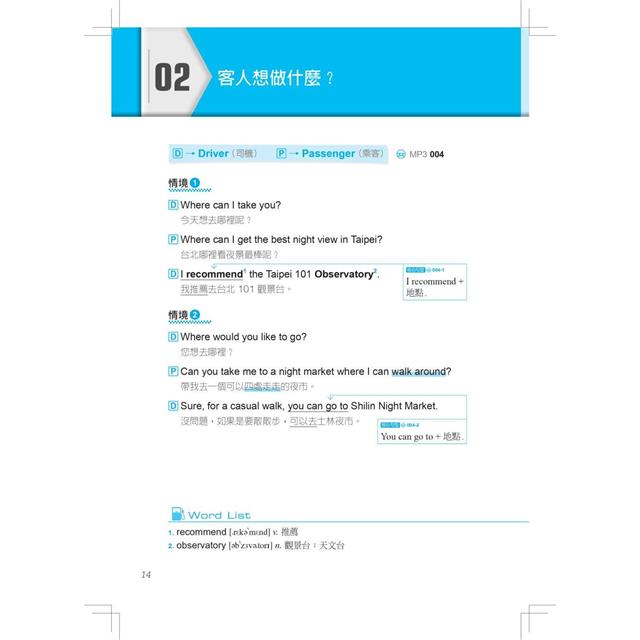 對於平日工作繁忙的讀者,需要短時間內高效學習,推薦必先閱讀的章節是第一章「關於乘客的需求」,內容包含溝通目的地、客人趕時間、客人的搭乘要求、客人常說的話等主題,有助於預先掌握常見情形,立即運用在工作與生活中。有時間慢慢學習的時候,則可進一步探索第二章與第三章,內容包括從乘客攔車/叫車、上車(放行李)、目的地、行車路線、收費到下車等整個過程中所有必備語句,以及行車途中若需要輕鬆攀談的萬用小聊天範例(珍奶、故宮、夜市、名勝古蹟、球賽等),讀完必定能使英語聊天能力大為增長!此外,本書也收錄了 Uber 專區,以及路上可能發生的特殊情境(遇到警察臨檢、「馬路三寶」、車禍事故等),方便讀者依照實際需求學習所需語句。