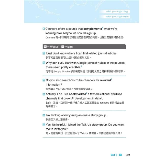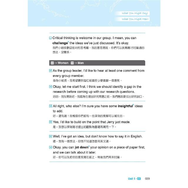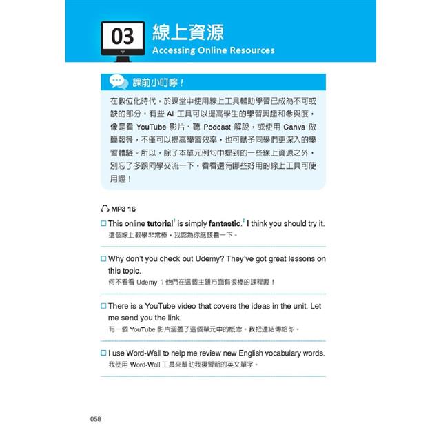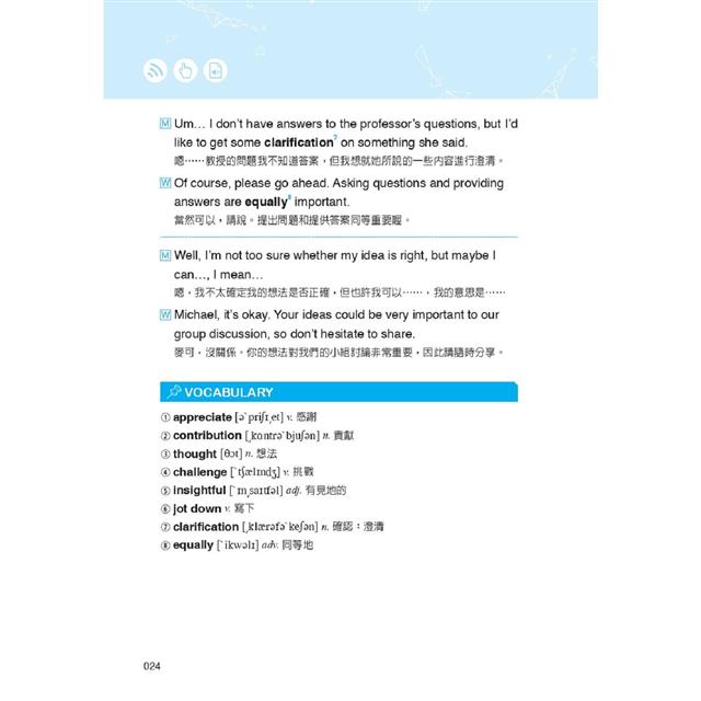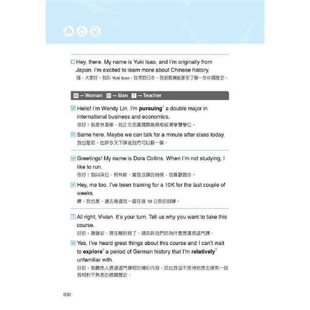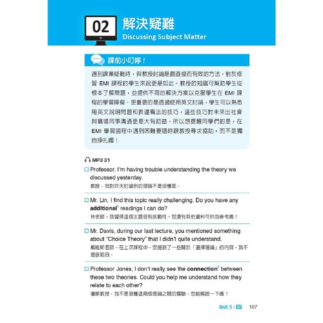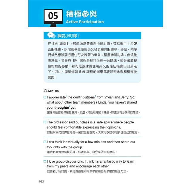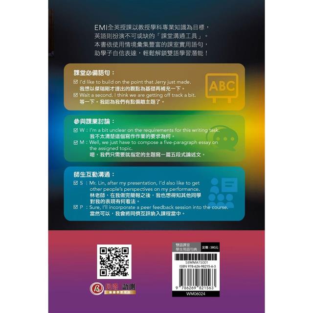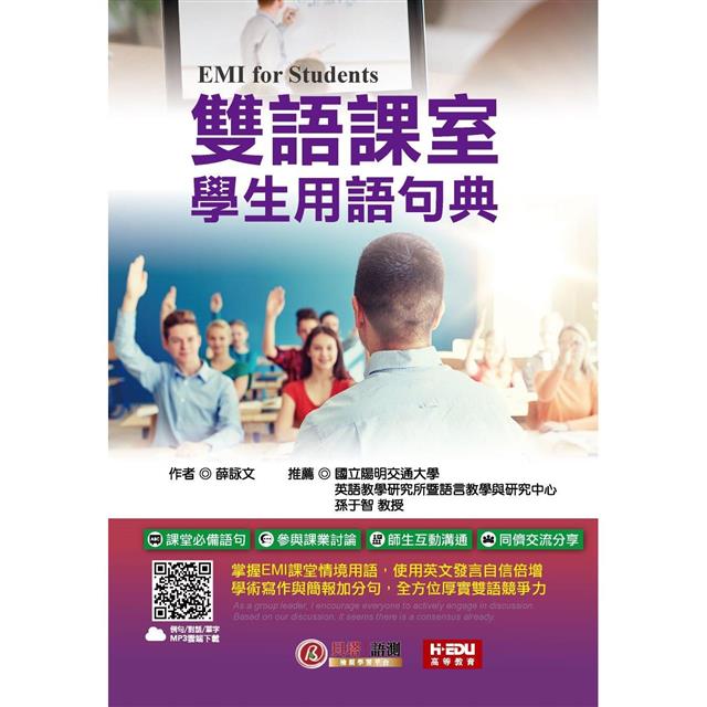 本書即是專為雙語教學環境而設計,以各式在雙語課堂內的情境做為分類,包括:和同學討論所選修的 EMI 課程內容、分組協商及輪流發言的禮貌說法、表達意見或舉例佐證的溝通技巧等,無一不是同學們可立即派上用場的實用語句,搭配中文翻譯及語音朗讀,幫助學生能自信參與課堂互動,輕鬆掌握專業知識。