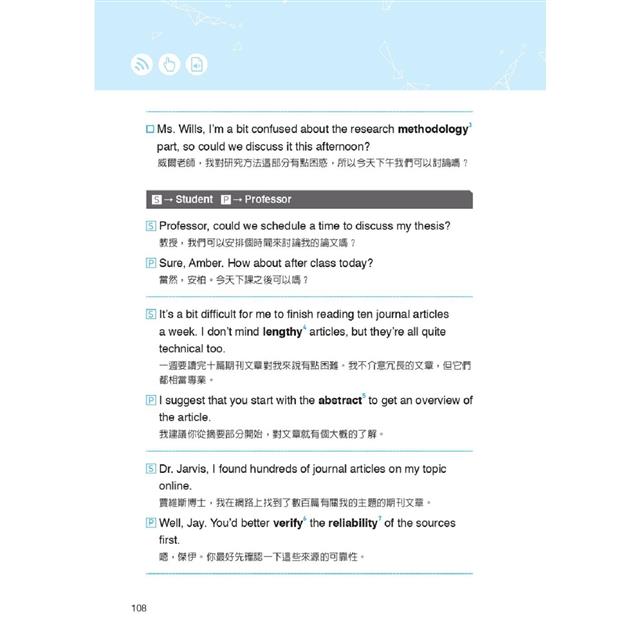 有鑑於學術簡報及寫作是當今高教國際化風潮下研究生必備的能力,本書於附錄中增列「學術簡報常用句型」及「學術寫作加分語庫」,大幅提升讀者使用本書的效益。除了學會如何在課堂中輕鬆、靈活地以英文面對各類溝通情境,更能善用附錄兩單元的學術發表及寫作寶典,完勝學位論文的挑戰,無論對於在國內就學或遠赴海外求學的莘莘學子,都是一本不可或缺的實用工具書。