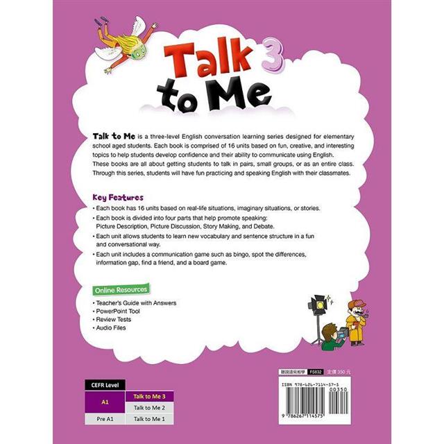 Talk to Me 系列共分為三冊,此書為第二冊。希望讓國小階段的學習者,經由大量的對話練習,逐步發展英語口說技能。每冊有 16 個單元,將多元、富有創意的主題,融入生活情境、假想情境和經典故事,幫助學生培養用英語溝通的能力與自信。本系列讓學生能夠以兩人活動、小組活動或全班活動的方式,增加跟同學們練習開口說英語的機會。每單元與書末附有趣味活動,例如賓果、桌遊等,讓學生能在輕鬆有趣的情境下運用英文。透過由淺入深的學習任務和單元主題,引導學生進行有趣的對話,並學習新的單字和句型,增進其英文實力。