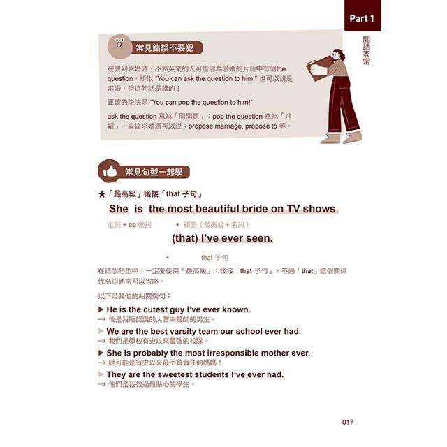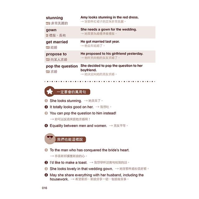 本書以「關鍵單字」、「萬用句」、「換句話說」等內容,幫助讀者抓住學習重點,掌握單字片語之餘也迅速掌握常用句,更能在同一個情境中使用不同的句子,再也不擔心詞窮!