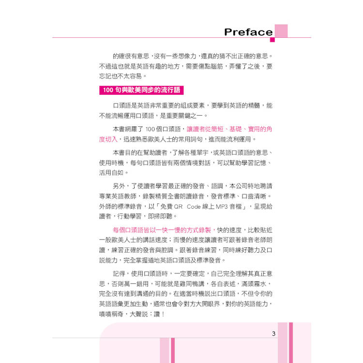 另外,爲了使讀者學習最正確的發音、語調,本公司特地聘請專業英語教師,錄製精質全書朗讀錄音,發音標準、口齒清晰。外師的標準錄音,以「免費QR Code線上MP3音檔」,呈現給讀者,行動學習,即掃即聽。