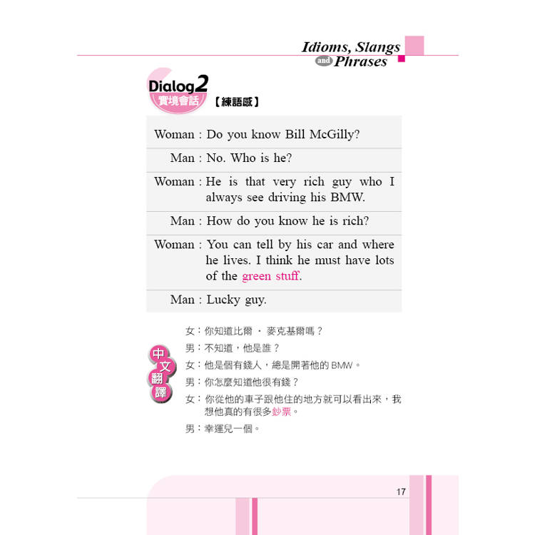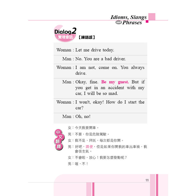 本書目的在幫助讀者,了解各種單宇,或英語口頭語的意思、使用時機,每句口頭語皆有兩個情境對話,可以幫助學習記憶、活用自如。