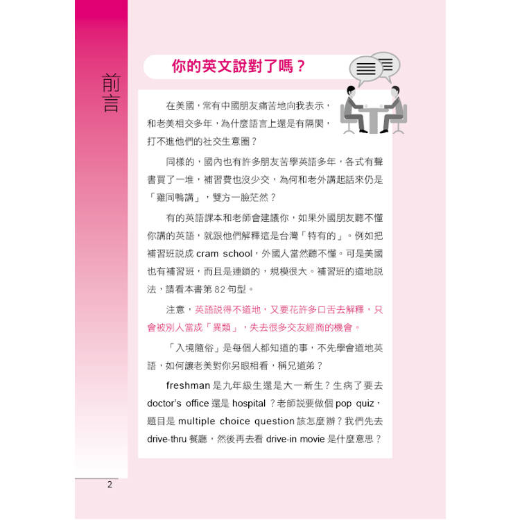 有的英語課本和老師會建議你,如果外國朋友聽不懂你講的英語,就跟他們解釋這是台灣「特有的」。例如把補習班說成cram school,外國人當然聽不懂。可是美國也有補習班,而且是連鎖的,規模很大。補習班的道地說法,請看本書第82 句型。