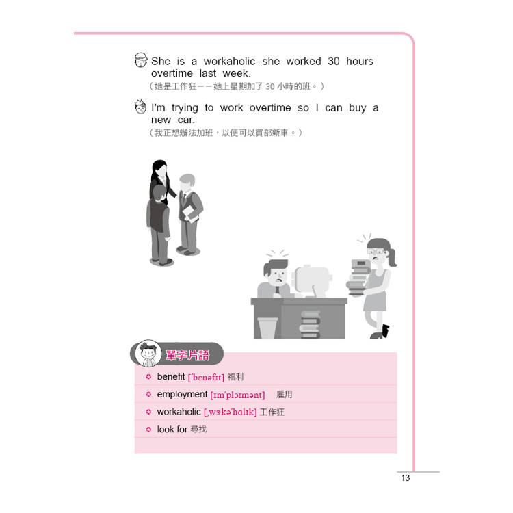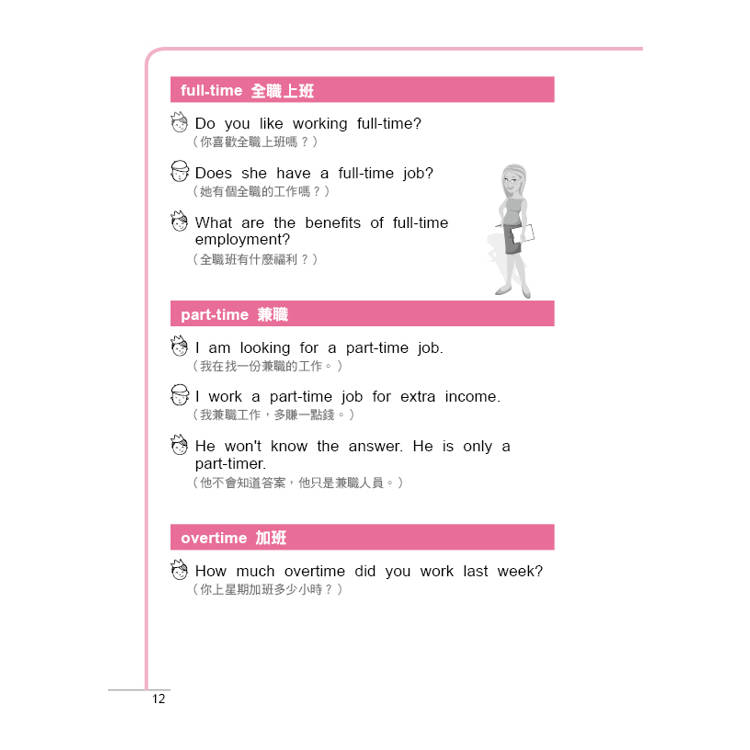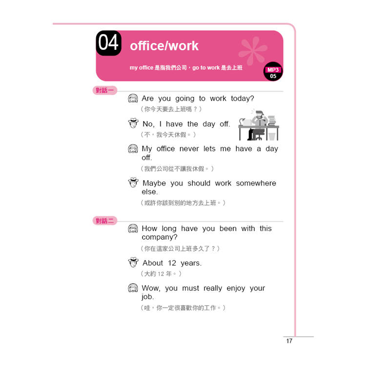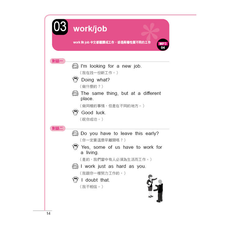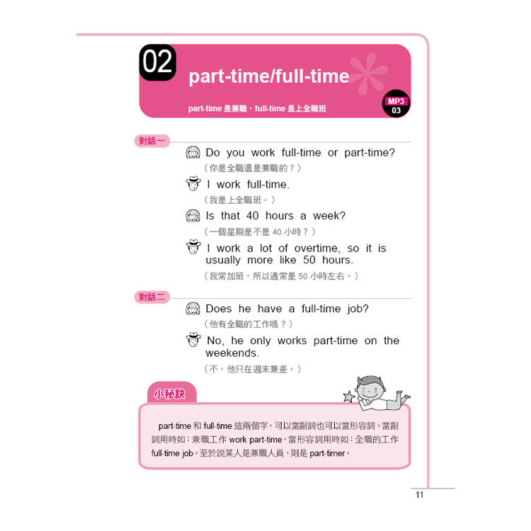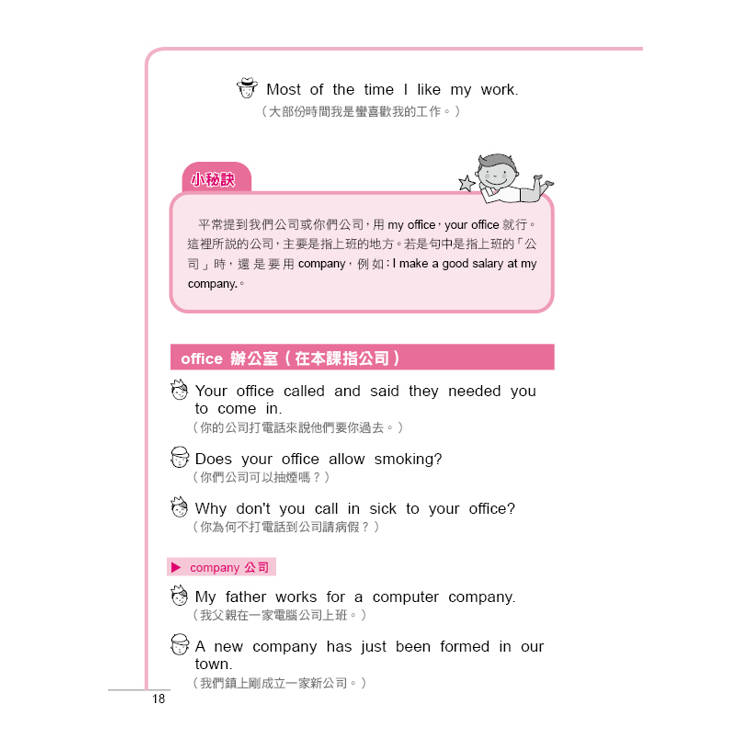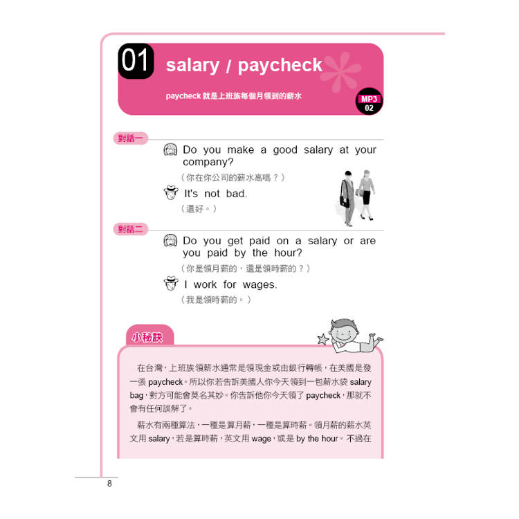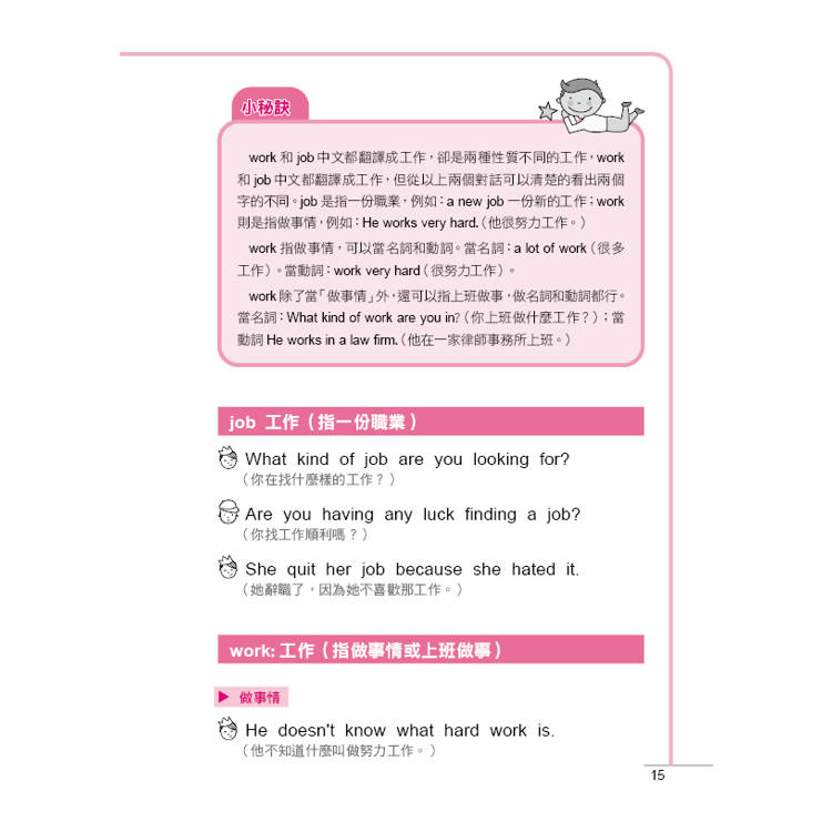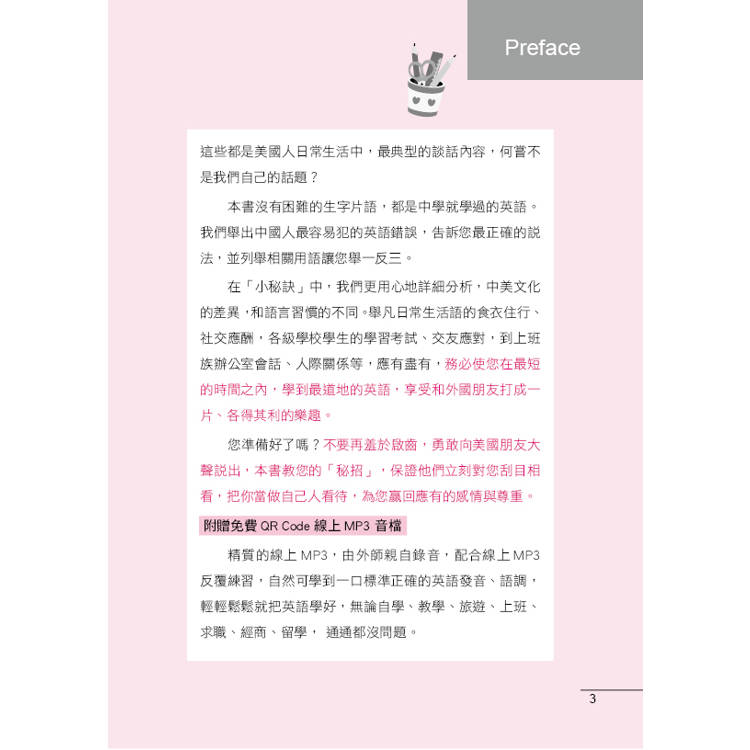 在「小秘訣」中,我們更用心地詳細分析,中美文化的差異,和語言習慣的不同。舉凡日常生活語的食衣住行、社交應酬,各級學校學生的學習考試、交友應對,到上班族辦公室會話、人際關係等,應有盡有,務必使您在最短的時間之內,學到最道地的英語,享受和外國朋友打成一片、各得其利的樂趣。