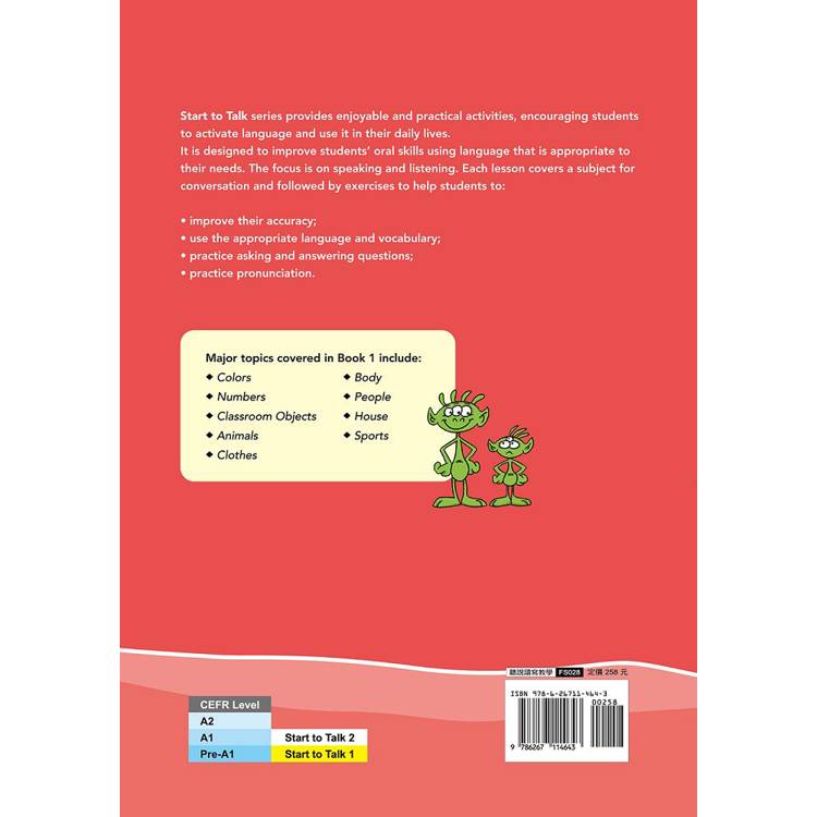 Start to Talk 系列共有兩冊,此書為第一冊。專為國小階段的英語學習者,提供主題式的單元練習,藉由循序漸進的練習,培養說英文的自信。每冊有 12 個單元,將日常生活中常見的對話主題,透過有趣的互動方式,讓學生使用學習到的單字和句型,進行對答或發表意見,達到增進英語口說技巧的目的。本書的重點在於聽力和口說兩部分,搭配分組活動與書寫練習,幫助學生順利完成各項口說任務,有效提升口說準確度與流利度。