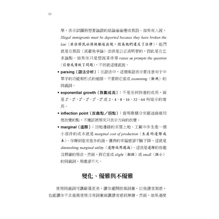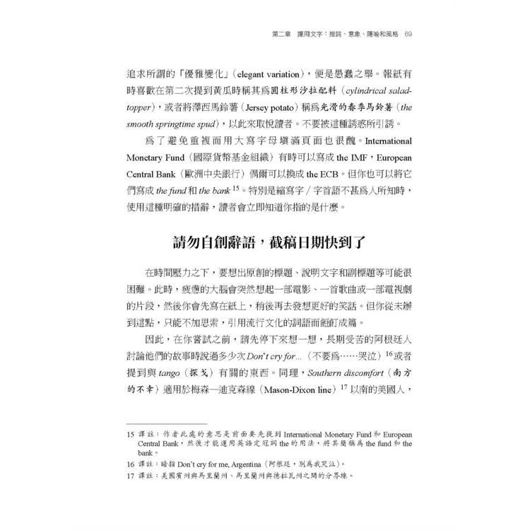第六章開始探究細節,逐一講解重要單字。我翻譯時力求文字清楚易懂。讀者可視各自需求瀏覽內文。此處稍微提幾個有趣的條目。在美國,quite是一個強化副詞,類似於very;在英國,它通常表示moderately或reasonably,所以用它修飾某個字,通常不是讚美。動詞table在英國的意思是提出某件事來採取行動,但是在美國,情況恰好相反,表示擱置。此外,若要用administration表示國家的政治領導層,最好只用來指實行總統制的國家,尤其是美國。採行議會制的政府可用government,而administration可以指常任的行政部門。cartel(卡特爾/同業聯盟)是控制供應以抬高售價的團體,別用它描述舊的syndicate(辛迪加/財團)或一群生產者(特別是毒販),除非他們做出卡特爾的行為,亦即集體哄抬價格。Frankenstein(法蘭根斯坦)是小說《科學怪人》的那位瘋狂科學家,不是他製造的怪物。那隻怪物的名稱是Frankenstein’s monster(法蘭根斯坦的怪物),小說常以「生物」、「魔鬼」、「東西」和「不幸者」稱呼它。