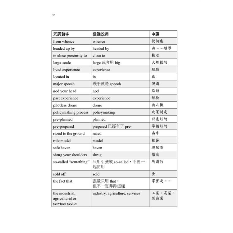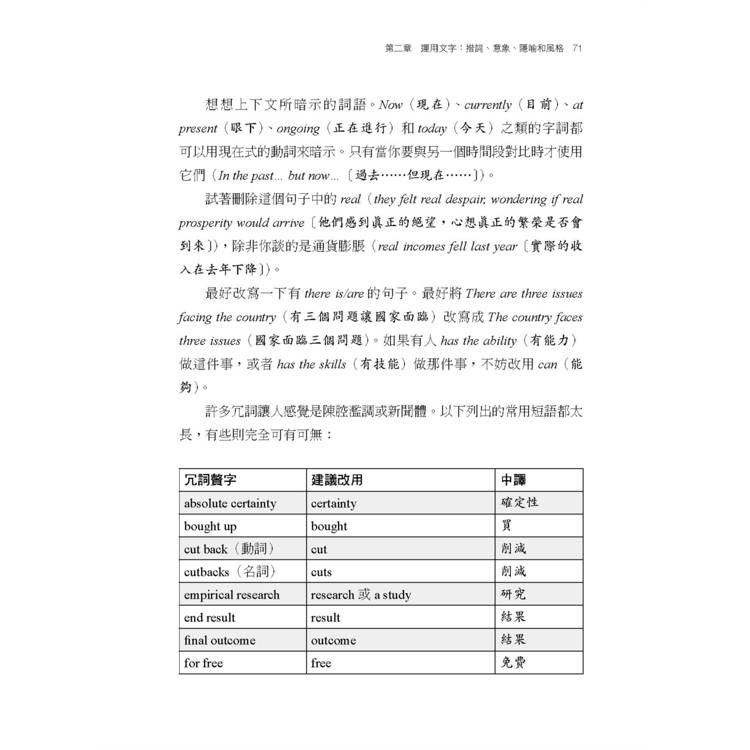本章也提到以there is/are開頭的句子,好比There are three issues facing the country,作者建議最好改成The country faces three issues(國家面臨三個問題)。我在大學執教多年,經常看到學生如此落筆,不僅文字拖沓,甚至在一句話出現兩個動詞而犯下文法錯誤。