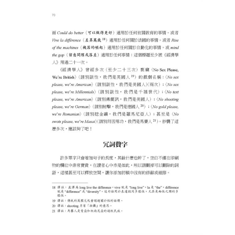 後續講解的規則類似於歐威爾和馬克.吐溫的規則。優秀作家一次又一次挖掘出這些規則,其中還包含《經濟學人》作者在過去一百八十多年獲取的心得。