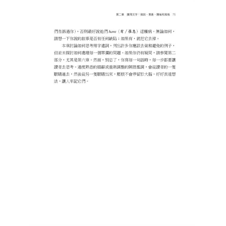 第二章探討文字運用。寫作時不免套用陳腔濫調或過時隱喻,偶爾為之尚可,但通篇如此便是欠缺思想,毫無新意。作者指出愛用陳腔濫調的新聞文體,舉例說明記者堆砌陳腐措詞,讓意象紛陳,猶如大雜燴,行文拙劣不堪。