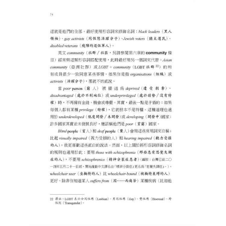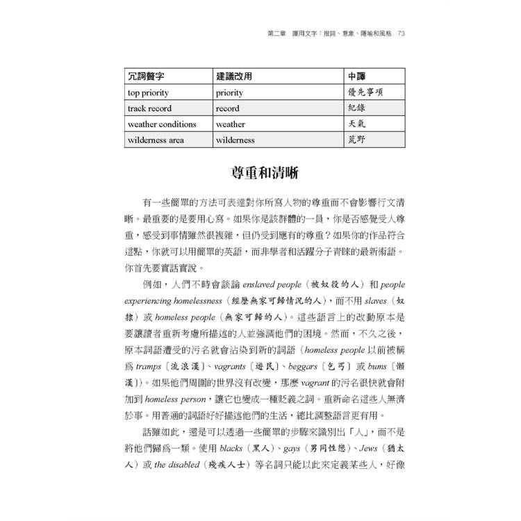 作者最後說明如何用簡單的英語把話說清楚,但又能尊重描述的個人或群體。這段言之有理,值得深思。喬治.卡林(George Carlin)說過關於委婉說法(euphemism)的相聲段子,痛斥美國人偏好拐彎抹角,不肯開門見山,實話實說。這位黑色幽默大師與作者隔岸呼應,雙方不謀而合。本書後續也不時指出,掩飾逃避的英語說法讓文章死氣沉沉,令人難以卒讀。