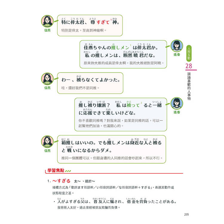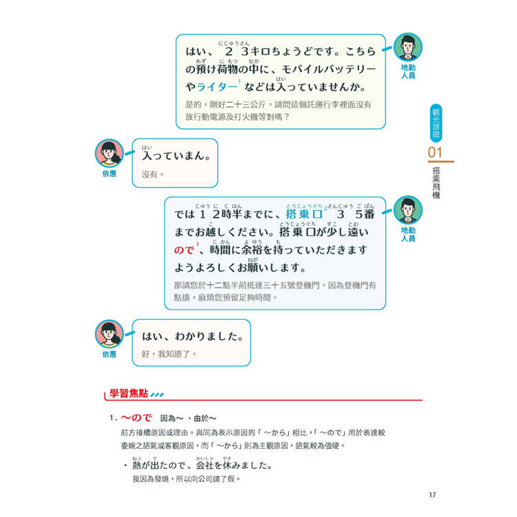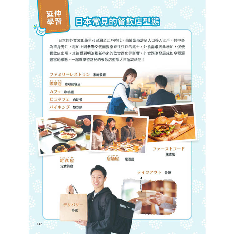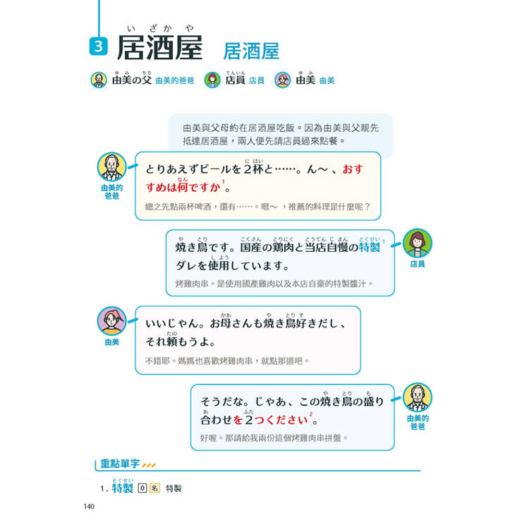 每單元皆由三則情境會話組成,內文採用日中對照排版,供您確認語意。文中除了標示必備重點單字外,也為您解析實用文法句型、慣用表現,並搭配例句及中文說明,帶您快速掌握最自然、貼切的表達方式。每單元最後更附有「延伸學習」,補充與主題相關的語言或文化小知識,實用又有趣。此外,本書除了可搭配會話影片、朗讀音檔等多媒體素材學習外,更可利用附贈之AI小助教練習日語口說,藉此檢視學習成果,方便又有效率。