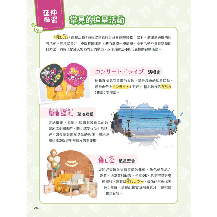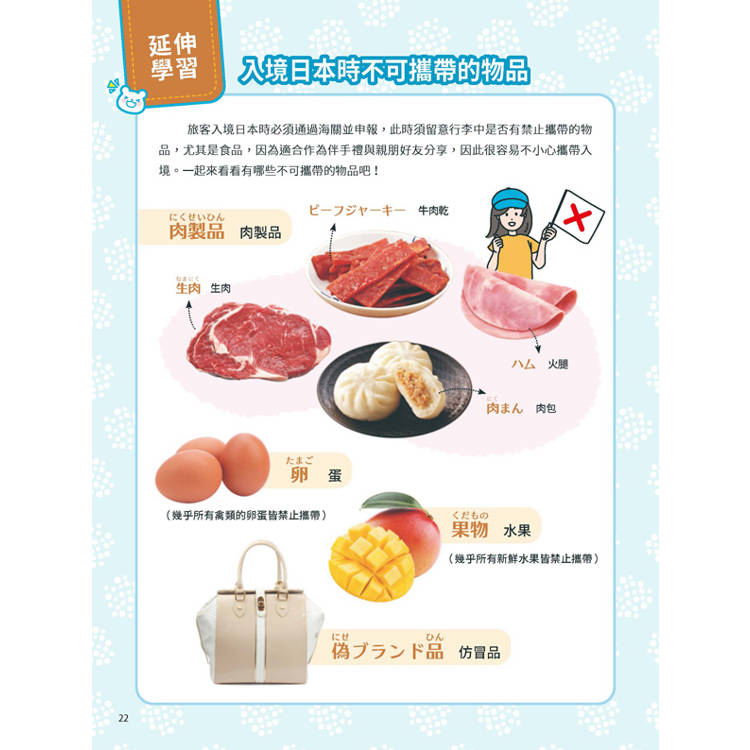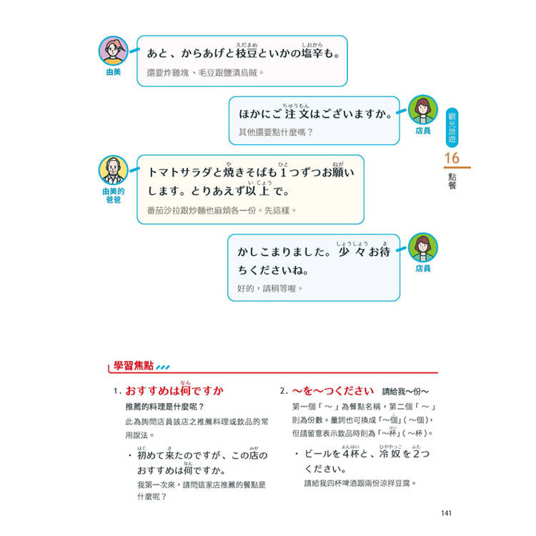 本書分為兩大主題,在「觀光旅遊」中,收錄了點餐、購票、結帳、搭乘交通工具、入住飯店、從事觀光活動等單元,涵蓋旅途中一定會碰到的各種情境;而在「人際互動」中,收錄了自我介紹、談論喜歡的人事物、為他人加油、表達感謝等內容,讓您與日本朋友輕鬆溝通,暢所欲言。
