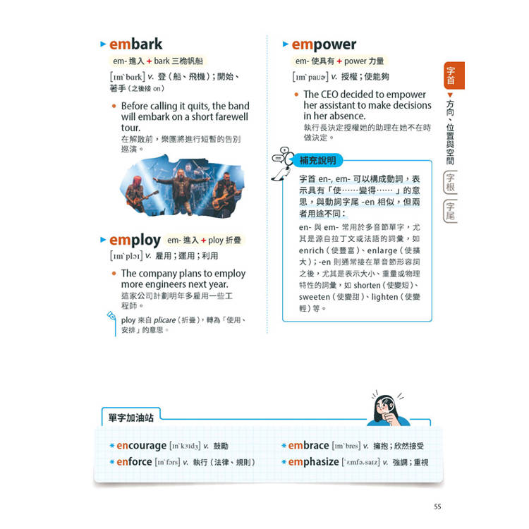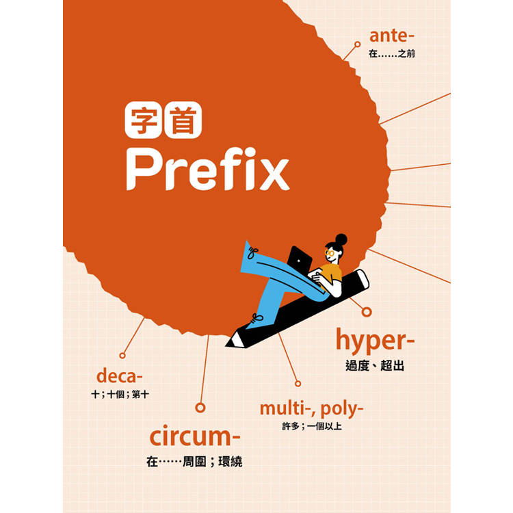 ● 字首篇涵蓋「數量與數字、程度與範圍、方向與位置、否定與對立、時間與順序、身分與關係、自然與社會」等常見字首,幫助讀者快速推敲陌生單字的基本意涵。
