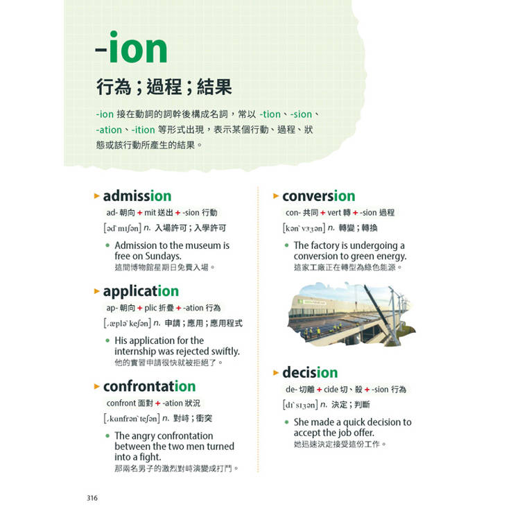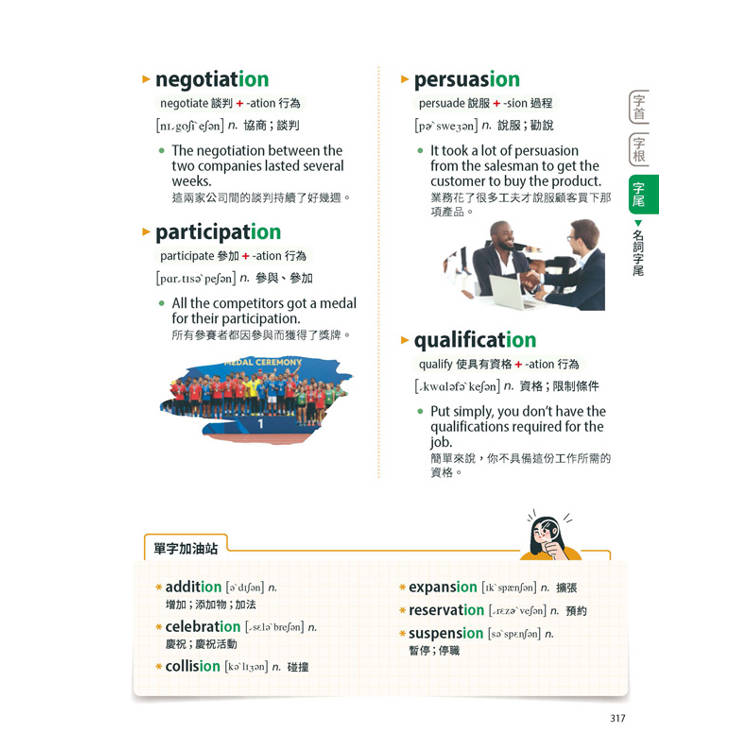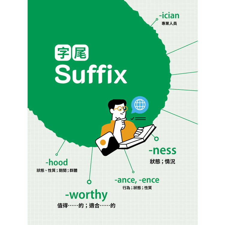 ● 字尾篇收錄名詞、形容詞、動詞與副詞的常見字尾,說明其語義與功能,幫助理解單字在不同語境中的變化與應用。