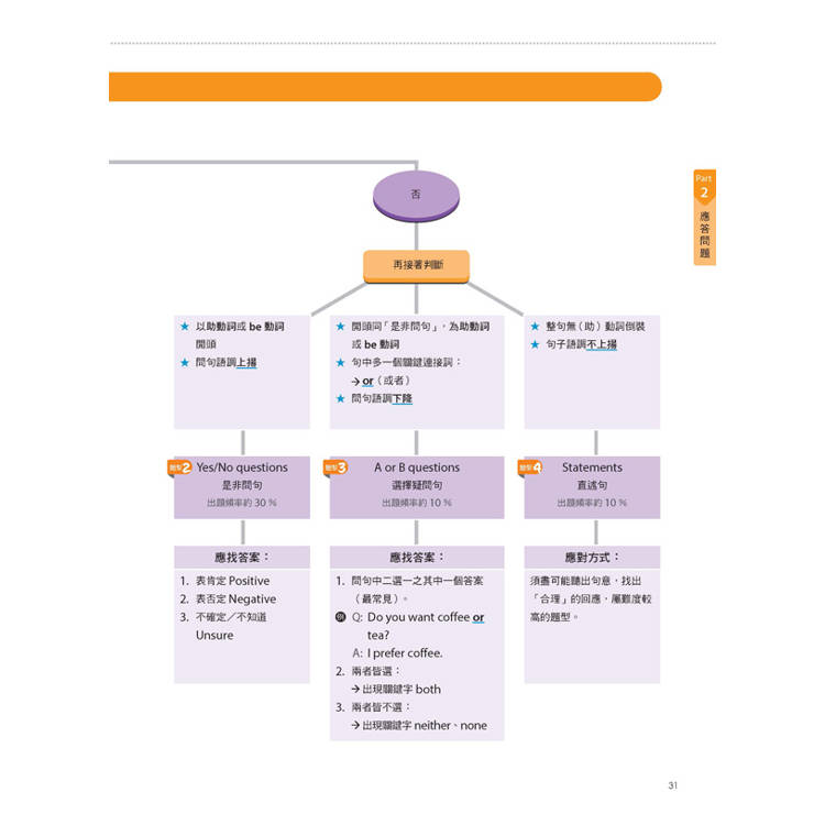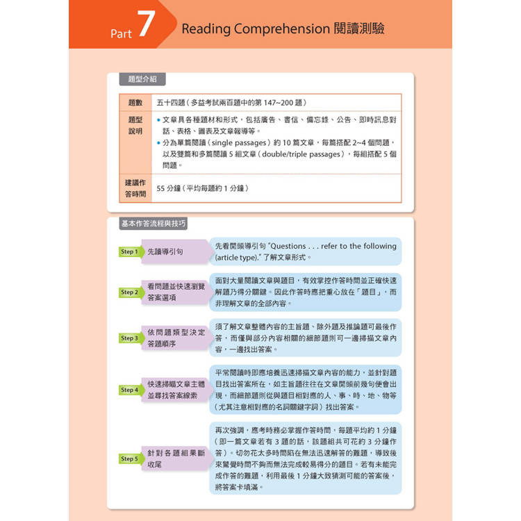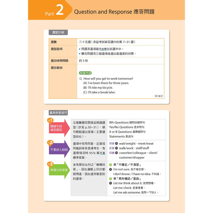 每單元一開始先歸納多益各大題的題數、考法、題目時間間隔或建議作答時間,並提供考題範例及基本作答流程與技巧,讓讀者迅速掌握應考方式與應答訣竅。