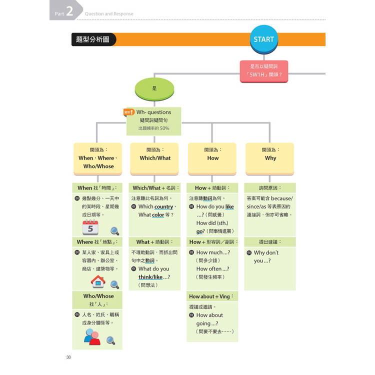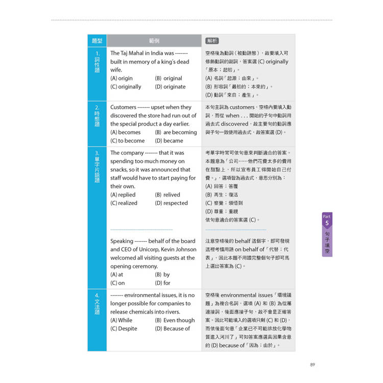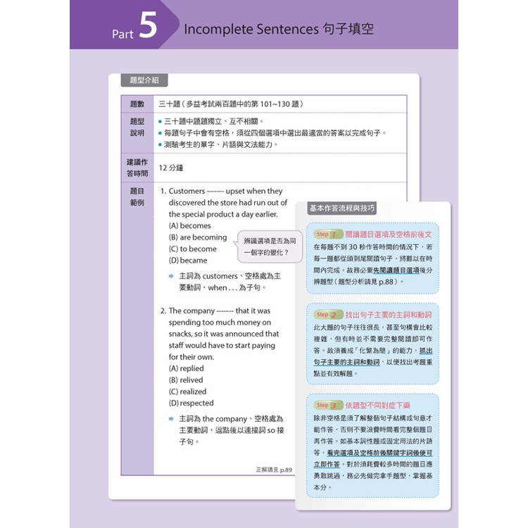 例如Part 1「照片描述」中多人照的解題技巧是要觀察其中人物動作的共通性及差異性;物件照則要留意擺放位置及相對關係等。Part 5「句子填空」則將考題歸納為詞性、時態、單字片語與文法等四大題型,各類題型皆提供重點整理與練習題。