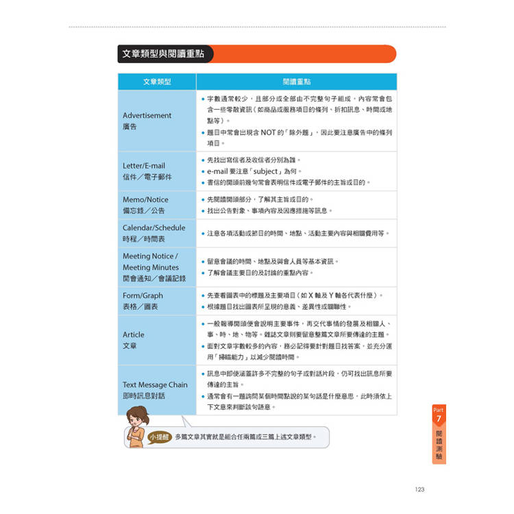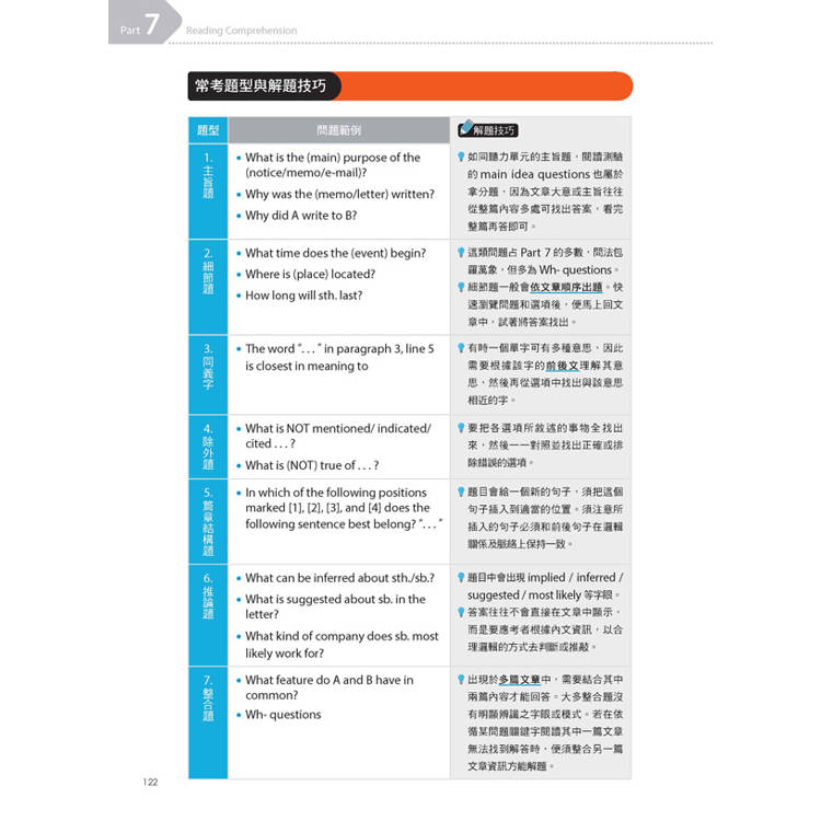 1. 以表格呈現多益各大題型考法與基本作答技巧
