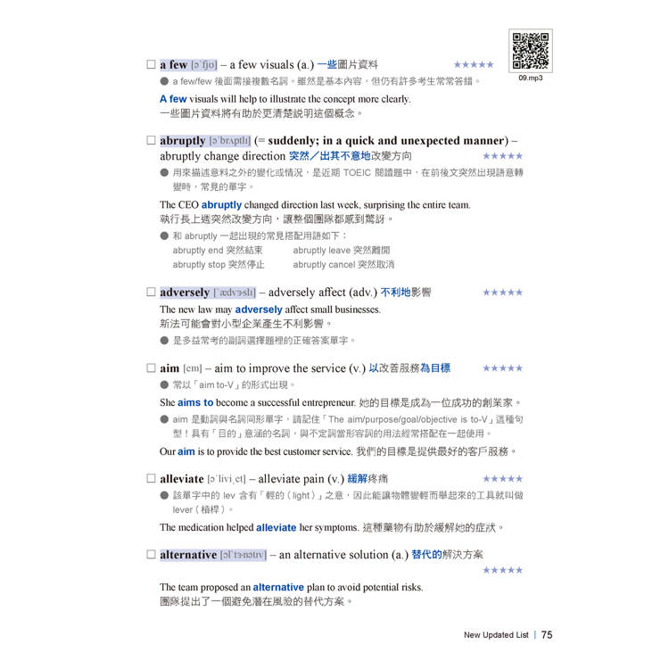 此外還將多益常見字彙依照實際出題頻率進行分級,從五星到一星,明確標示每個單字在考題中出現的可能性。這樣的設計不僅讓讀者能快速辨識出「最值得優先記憶」的高頻字彙,也有效降低在時間有限時的準備壓力。無論是初學者還是追求高分的考生,都能根據自身目標挑選合適的學習範圍,掌握重點不再靠運氣。