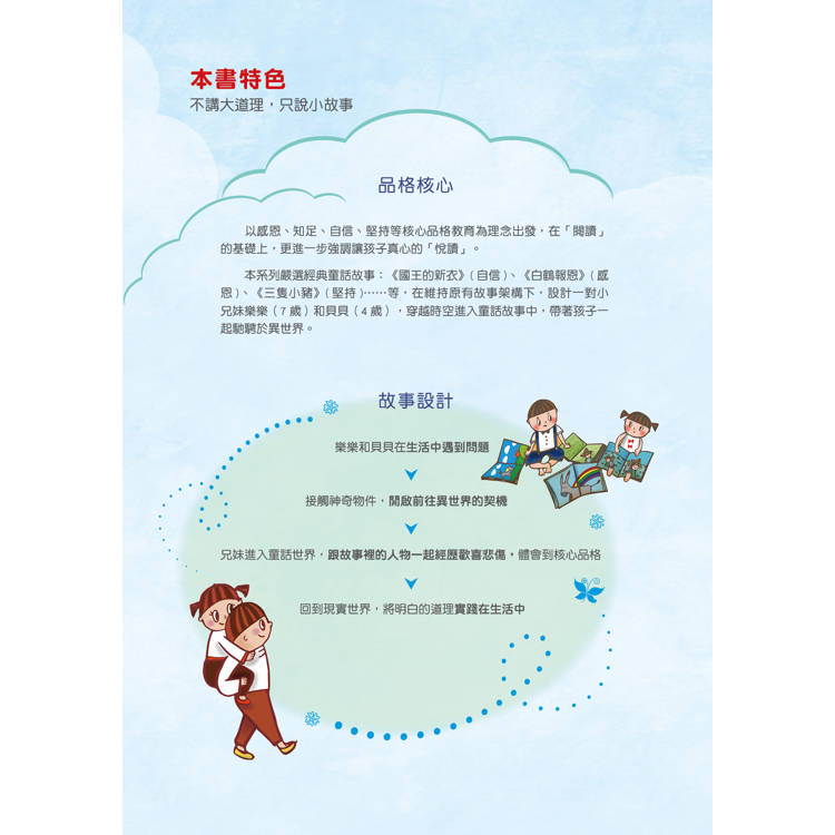 不僅以感恩、知足、自信、堅持等核心品格教育為理念出發,在「閱讀」的基礎上,更進一步強調「悅讀」。嚴選經典童話故事,在維持原有故事架構下,設計一對小兄妹樂樂和貝貝,穿越時空進入故事,和故事裡的人物一起探險,並將領悟到的道理實踐在現實生活中。現在就讓可愛又活潑的兄妹倆,帶領聆聽的孩子一起馳騁於繽紛的異世界吧!讀繪本,聽故事,說說看,想一想,動手玩。利用 QR code 掃描,透過雲端科技,就可以得到更多資訊!