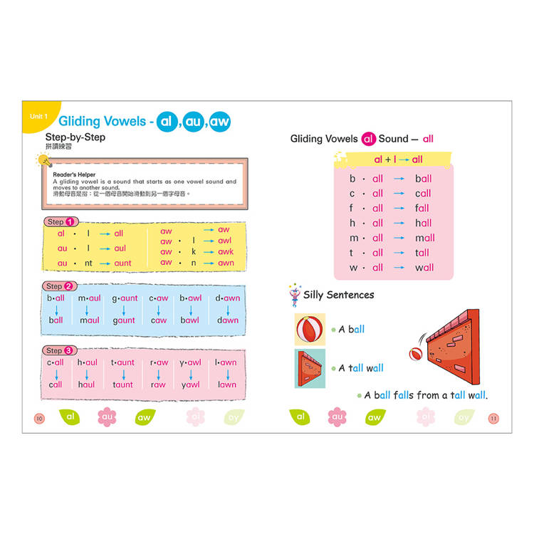 《Phonics Step-By-Step》自然發音拼讀系列的第五冊為Gliding Vowels,又被稱作為Diphthong (雙母音) ,是以兩個字母為主軸,共同發一個音節。在音節裡的兩個母音或兩個字母,組合成一個整體的發音,如:a_l、a_u、a_w、o_i、o_y、o_o、u_e、o_u、o_w 等音組,會在發音時從第一個字母開始發音連動滑音到第二個字母,產生嘴型的變化,以及舌位的滑動,而得名。由於有兩個母音或兩個字母的發音,所有雙母音都有發音的起始和結束。