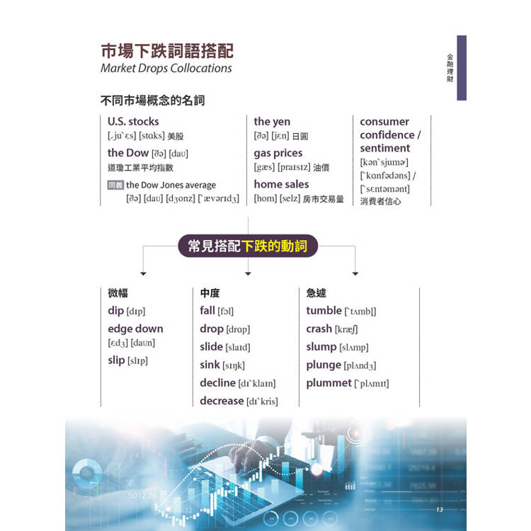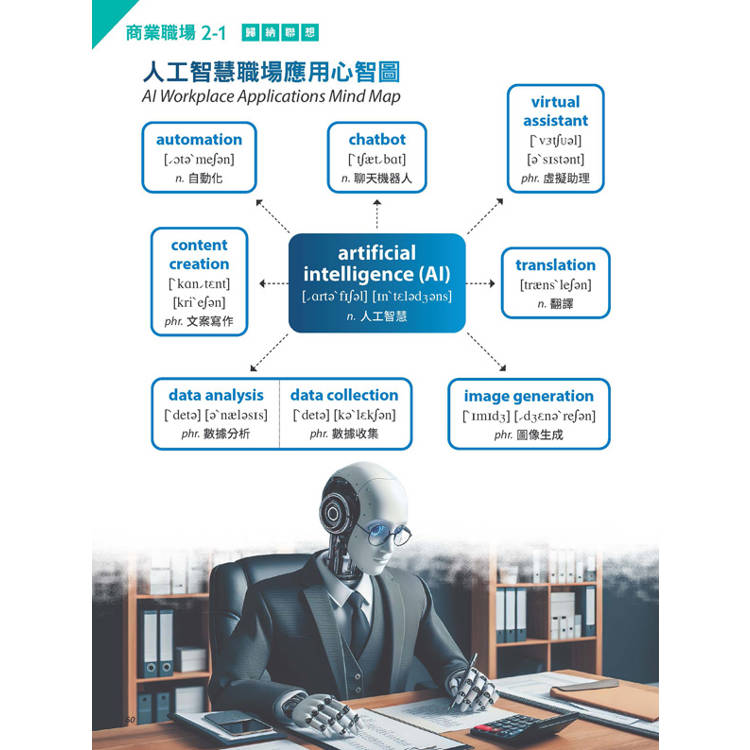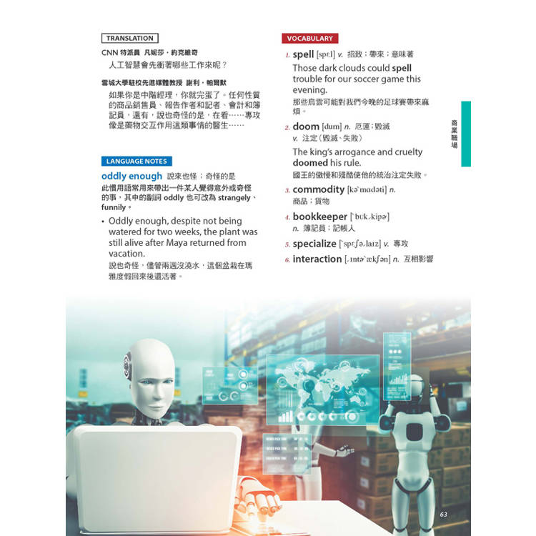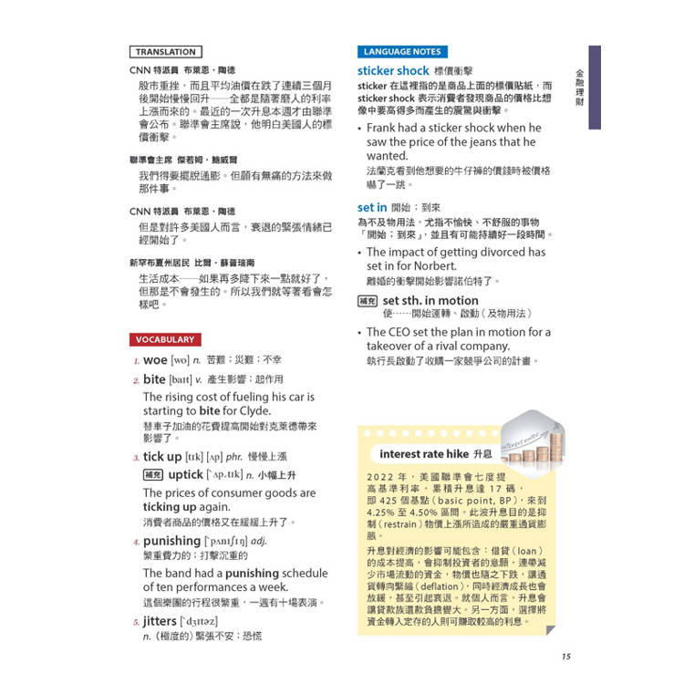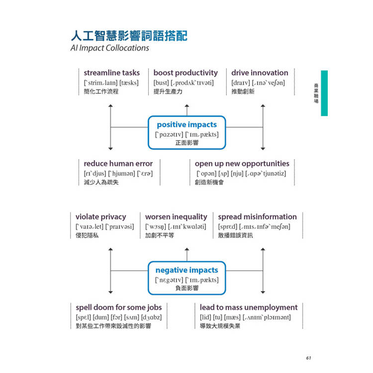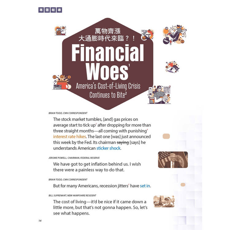 全書共分為六大主題:金融理財、商業職場、交通運輸、社群媒體、娛樂產業以及美食文化。每個主題收錄五篇CNN專題報導,並在每篇報導前精心設計心智圖與詞語搭配整理,幫助讀者掌握該新聞議題的核心字彙。透過先建構字彙基礎,再逐步進入新聞內容,讀者能有效提升英語聽力與閱讀能力,輕鬆掌握CNN原音報導的重點。