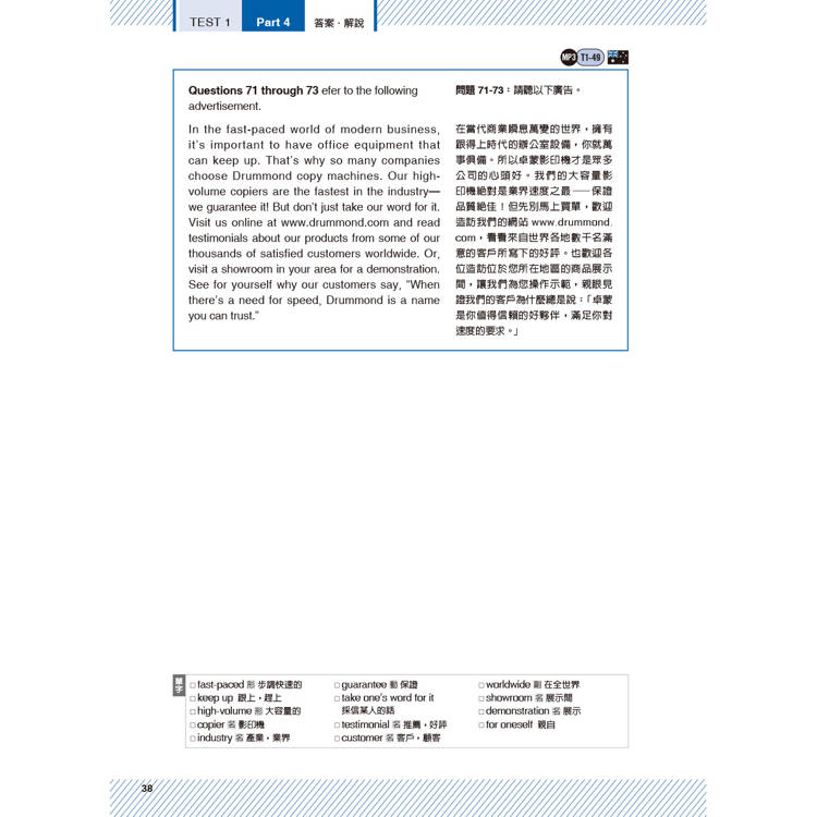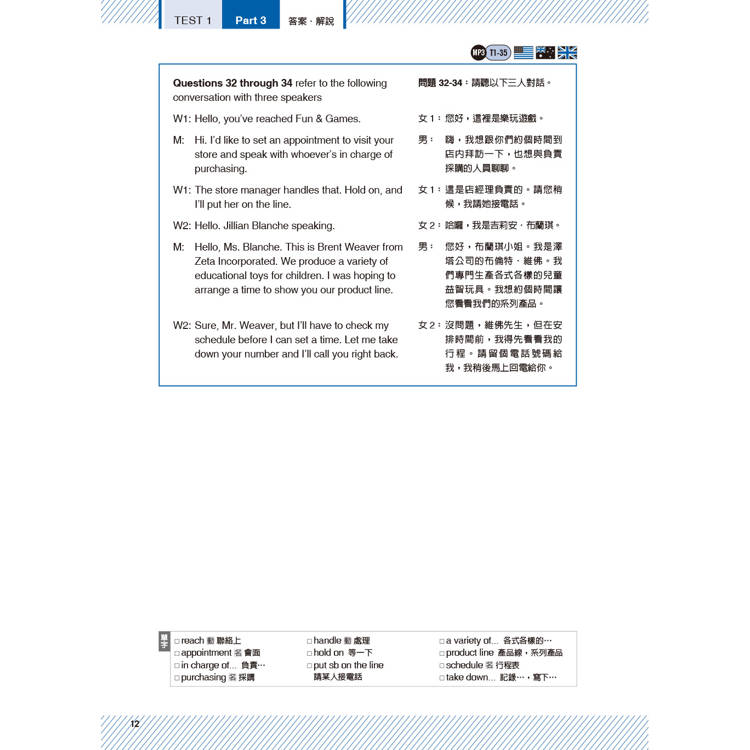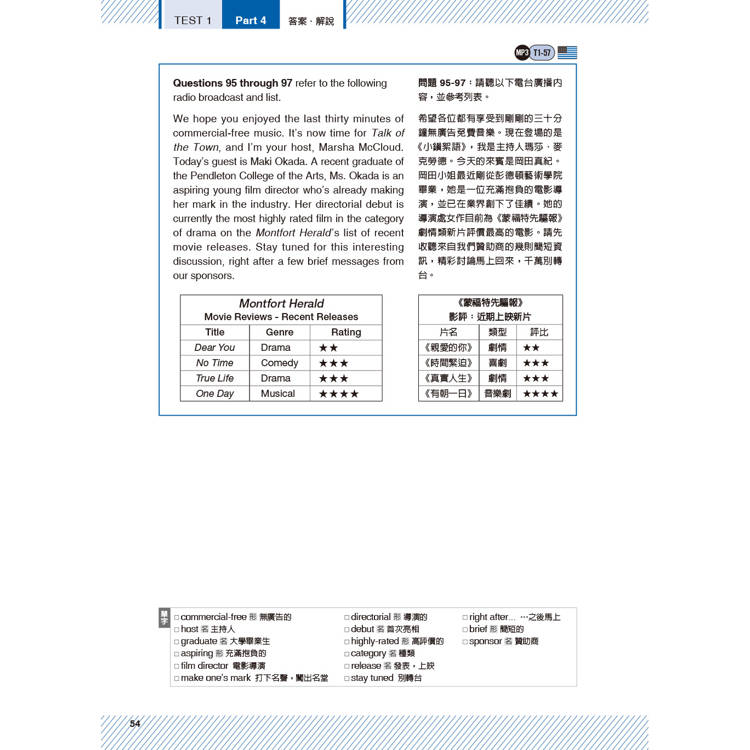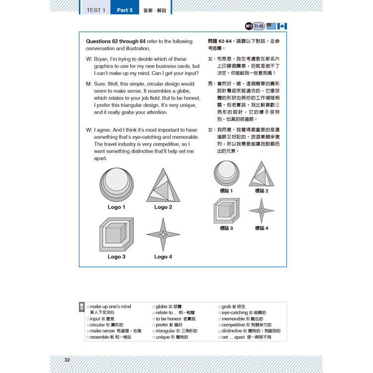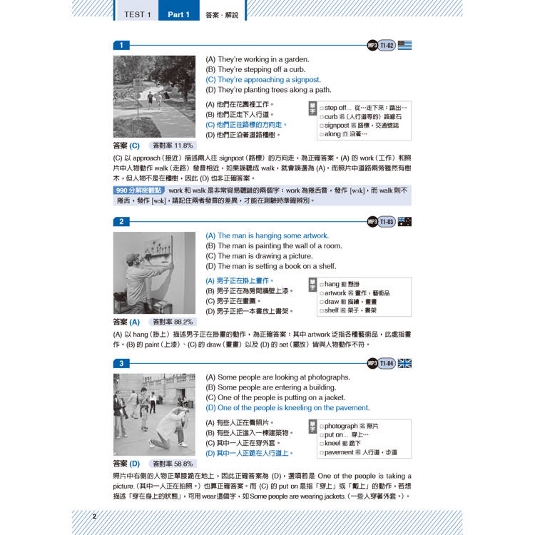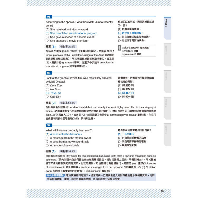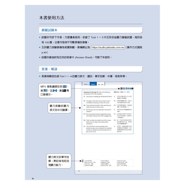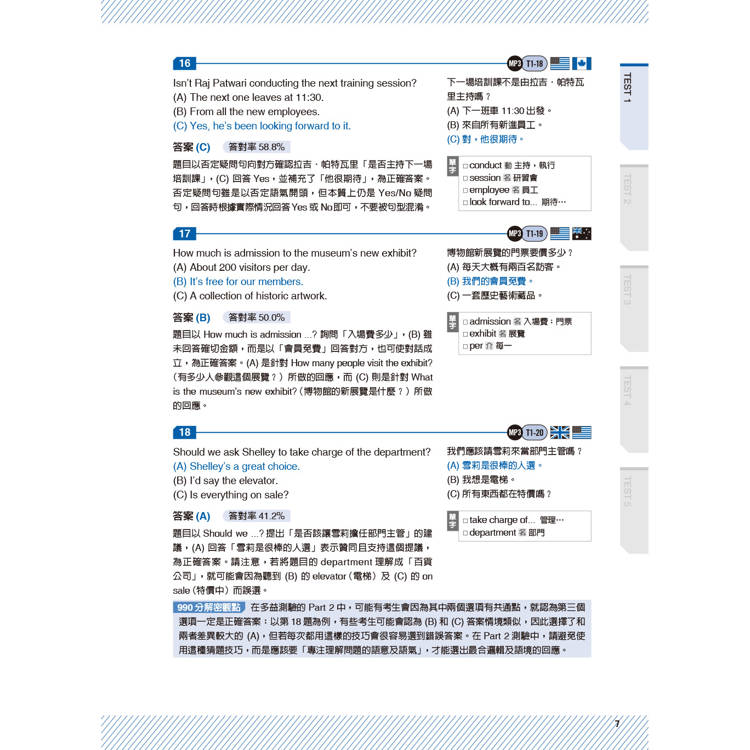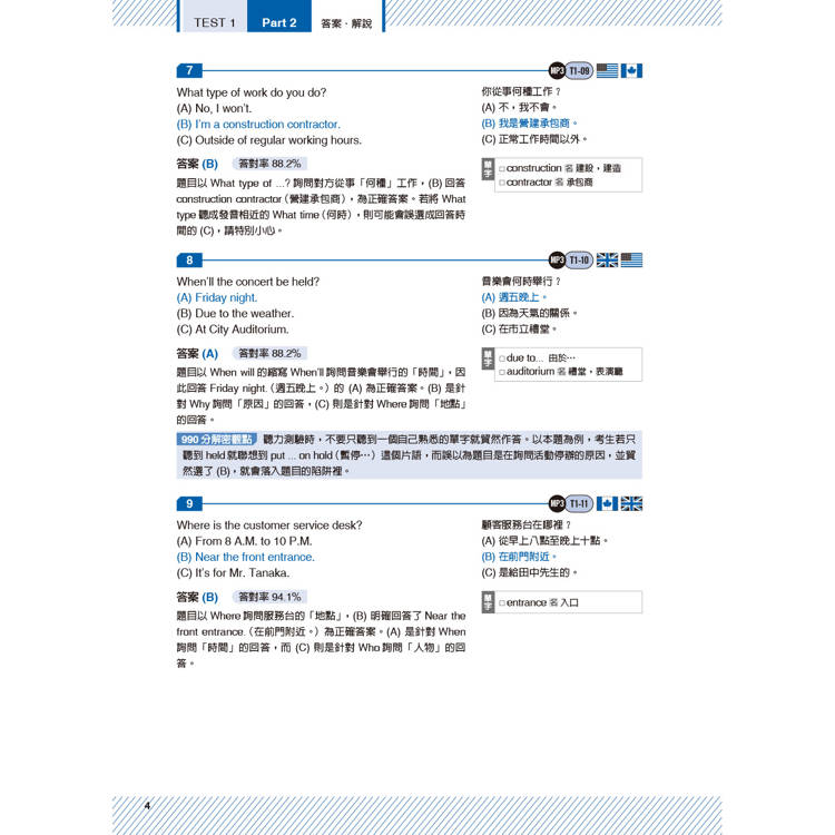 測驗考生對不同口音的敏銳度是多益聽力測驗的重點之一。本書收錄英、美、加、澳四國口音,由專業外籍錄音員以實際測驗的語速錄製而成。考生可下載免費MP3,並反覆聆聽,藉此建立對口音的敏銳度。