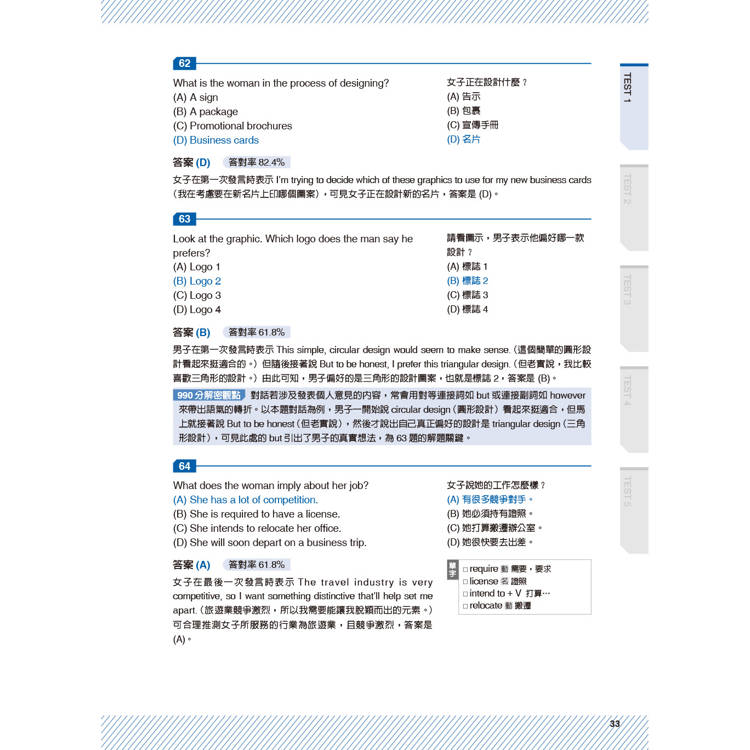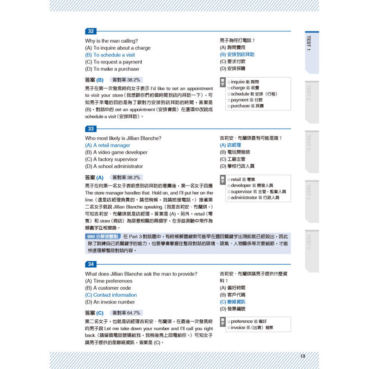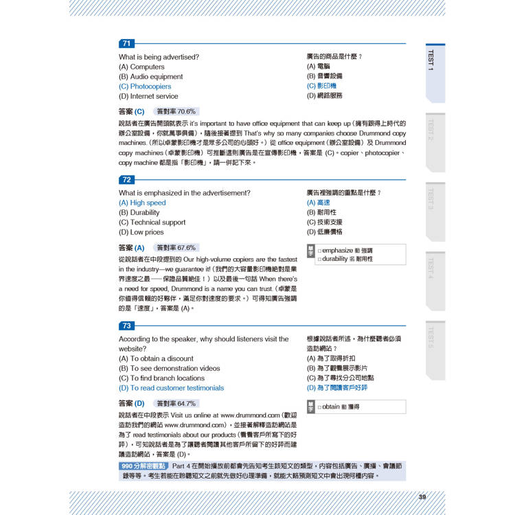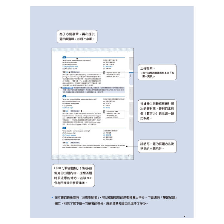 作者團隊平日總是站在講台上,身處教學第一線與學生互動,再搭配本教學機構獨有的答對率資料庫,我們能夠清楚知道考生容易出錯的地方在哪裡。本書不只把這些經驗放在每題的解說中,也額外延伸「990 分解密觀點」專欄,提醒考生必須留意的重要用法、考試技巧等。