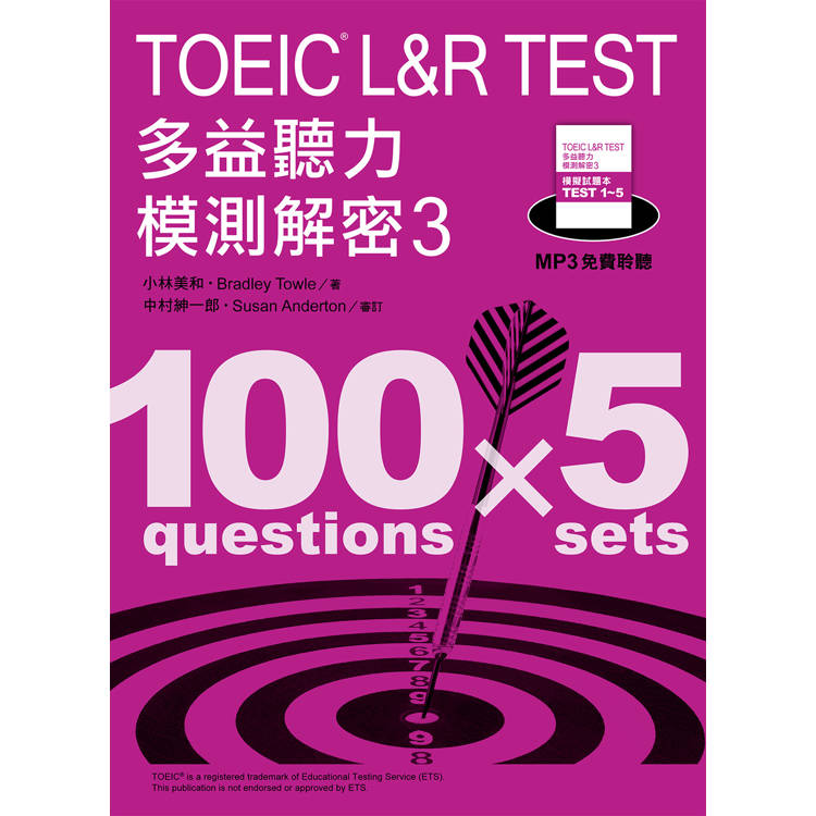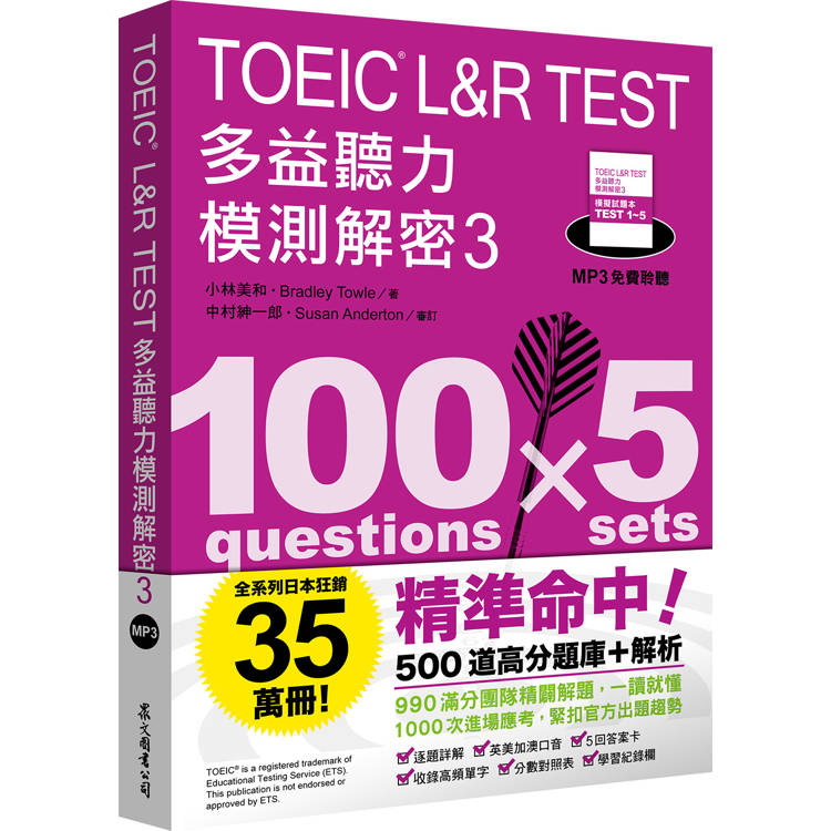 我們的講師包括英文母語者在內,至今已參加過1000 次以上的多益測驗,為考生仔細解析出題趨勢,提供正確且實用的資訊。近年來,我們先後出版了「TOEIC® L&R TEST 多益模測解密」系列的第一、二集,在銷售上取得了亮眼的成績,也陸續收到來自讀者的回饋,和我們分享考試成績在練習完該題庫之後大幅提升!因此,有許多讀者反映,希望還能有更多的題目。為回應廣大讀者需求,我們推出了「TOEIC® L&R TEST 多益模測解密」系列第三集!