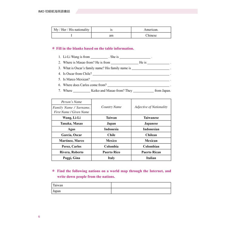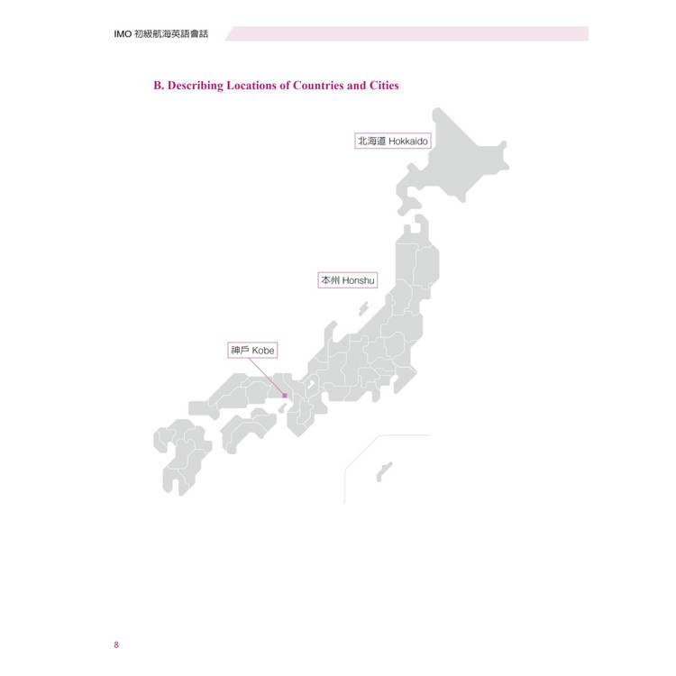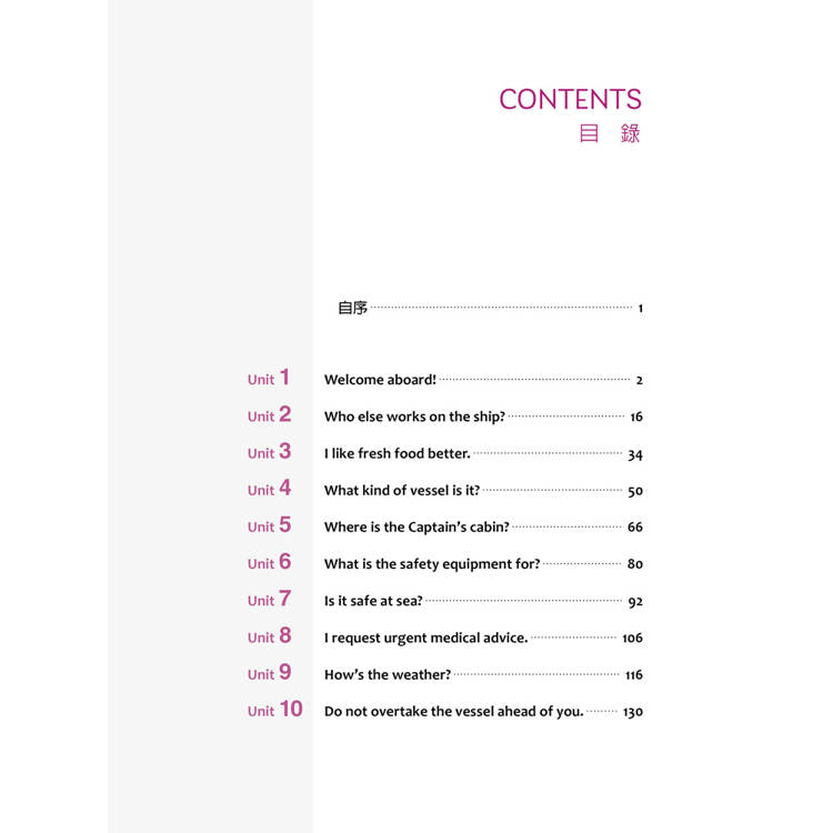 亞洲地區是非英語為母語國際船員的主要供應來源,然而卻無以語言學習觀點和航海學習者實際使用英語的情境,出版的航海生活英語會話教材。市面的一般英語會話教材雖多,內容包羅萬象,航海人員不易於短時間內找到直接相關航海生活情境的會話教材。基於以上因素,本書為輔助我國將進入海事訓練或相關工作,或對航海英語會話有興趣的人員編寫,以2015 年聯合國海事組織出版的Model Course 3.17 中的General Maritime English(GME)所規範的基礎級(Elementary Level) 18 項能力指標為架構和目標,編寫了航海環境中的生活和工作情境內容,包括自我介紹、描述工作、岸上餐廳點餐、訂房、問路、通訊、海上氣象等,強調航海生活中使用英語溝通表達的人際互動,並提供航海英文的基本字彙、常用英語文法及語用功能。有別於航海課程的專業內容,操船舵令之類的技術與用語非本書重點。期以航海生活的英語會話為目標,幫助學習者順利養成良好的英語溝通能力,進而享受航海生涯。