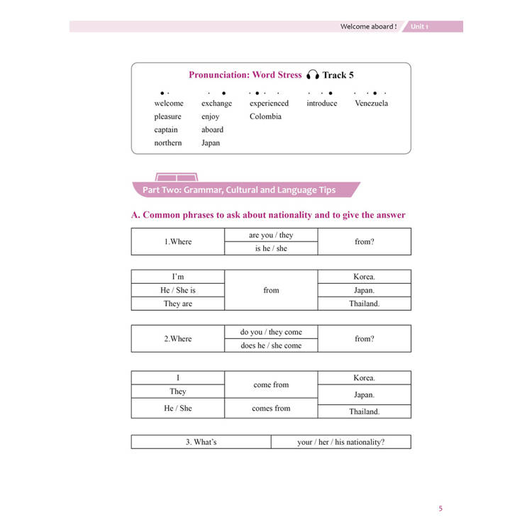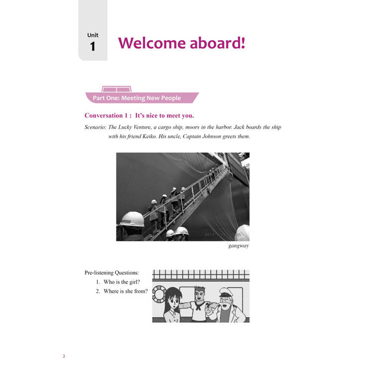 課文含十個主題單元,每單元分四部分,第一部分為兩篇主要對話範例、發音、聽說練習;第二部分為常用的航海英語文法、語用功能和文化意涵等說明及練習;第三部分為背景知識的短文閱讀和練習;第四部分延伸更多聽說寫的練習題。藉活潑生動的人物對話、海事故事、練習題和聽力,提供大量語言練習的機會,來增進學習者的聽說理解和表達能力。所有內容經國內兩位航海專家教授和三位外籍英語教師審稿校正。由英語為母語人士在專業錄音室中錄製成MP3。除課本和MP3 外,還有「學習手冊」,提供每課對應Model Course 3.17 的能力指標為何,學習內容的中文解說和延伸的學習材料指引。