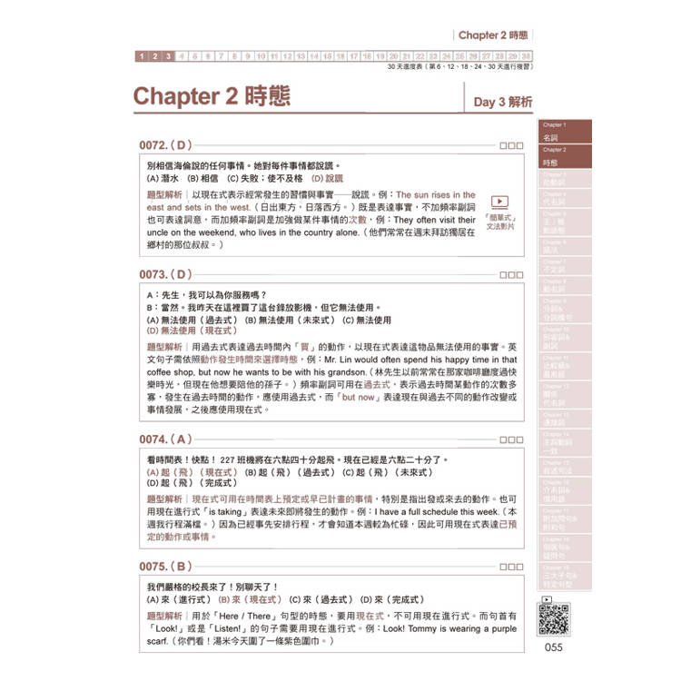 (2)下載完成後,可直接掃描內頁QR Code觀看影片。也可以手動點選想要的頁數,觀看該頁文法影片。