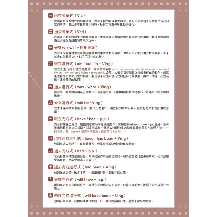 時態共有十二種,可依照時間的現在、過去、未來,和動作形式的簡單式、進行式、完成式、完成進行式來做區別。